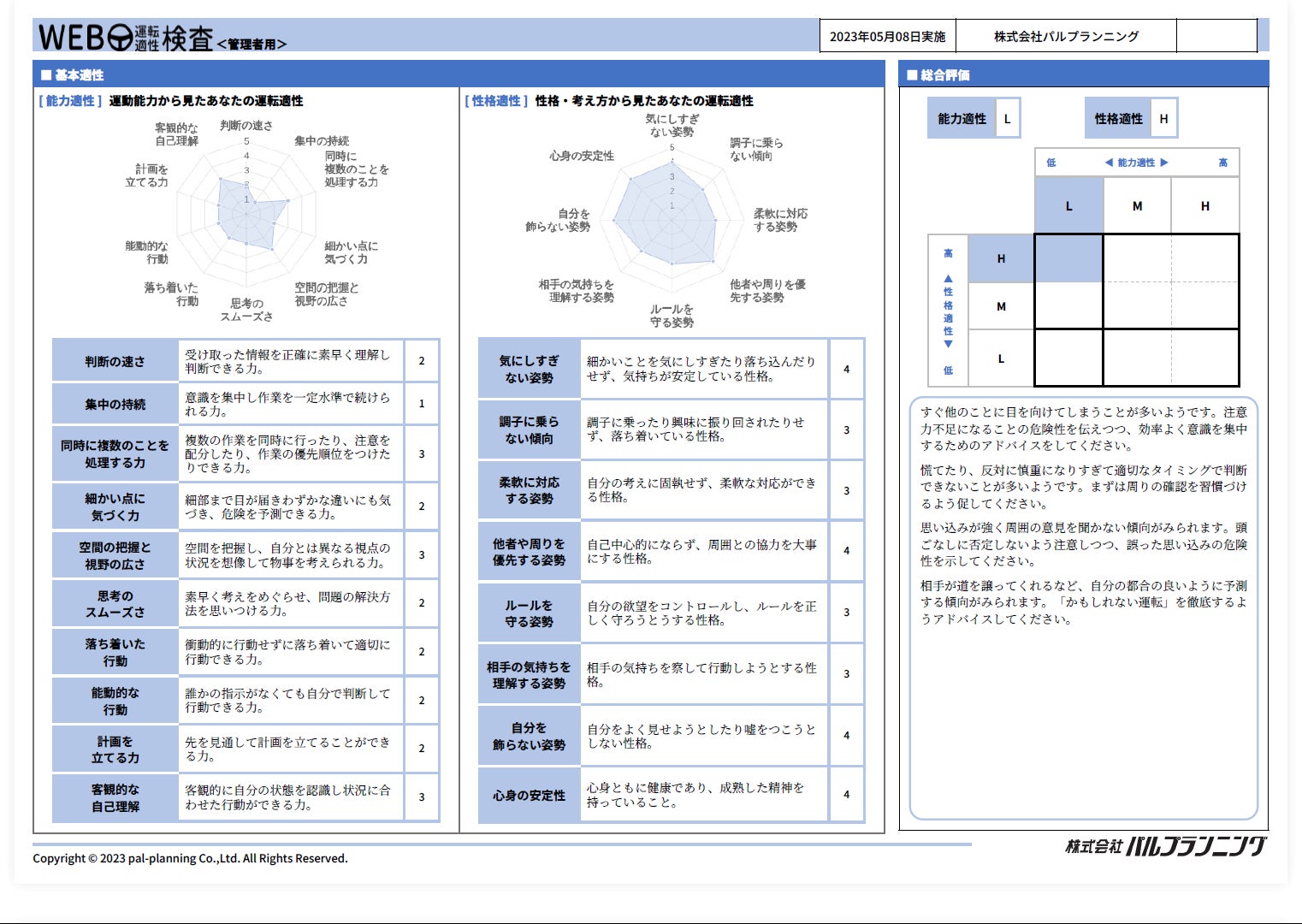 『WEB運転適性検査』では能力適性・性格適性・総合評価という3つの検査結果を出力します。