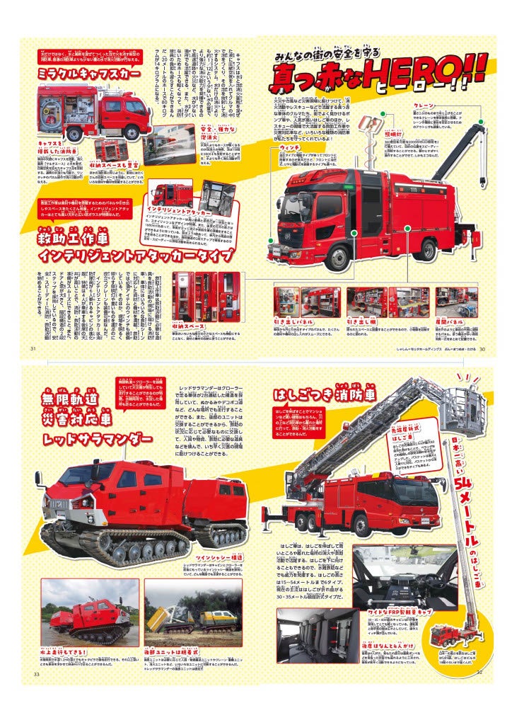 子どもに人気のはたらくクルマの特集は「真っ赤なヒーロー」。最新式の泡で消化する消防車や救助工作車に加え、先般の大雨の際にも出動した災害対応車「レッドサラマンダー」などを紹介しています。