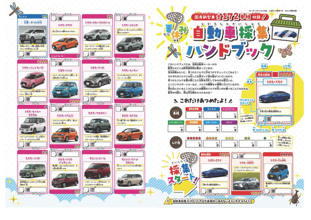 また特別付録として、現在販売されている国産新型乗用車のほぼすべて172車種を網羅した12ページ小冊子付き。昆虫採集の要領で、街なかで見つけた車種にチェックマークを入れていくことで、ゲーム感覚でクルマの形や車種名を覚えられます。