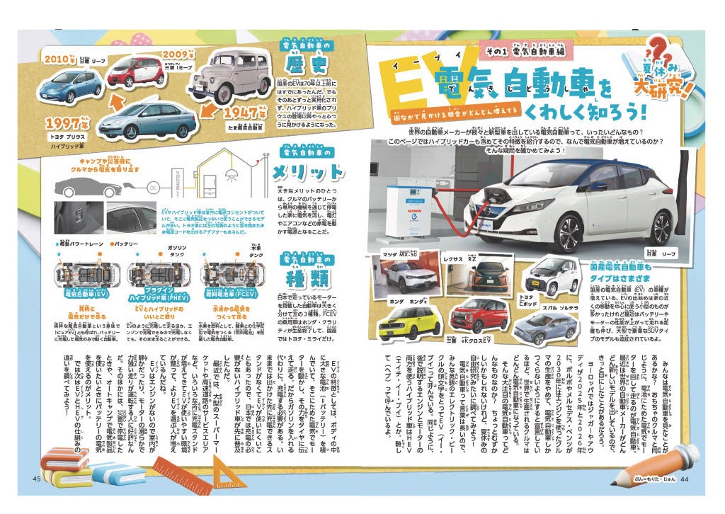 夏休み大研究は、パート1が電気自動車の仕組みやなぜ電気自動車が注目されるのかを解説するほか、パート2では自動車開発のお仕事の内容や楽しさを現役エンジニアにインタビューしています。
