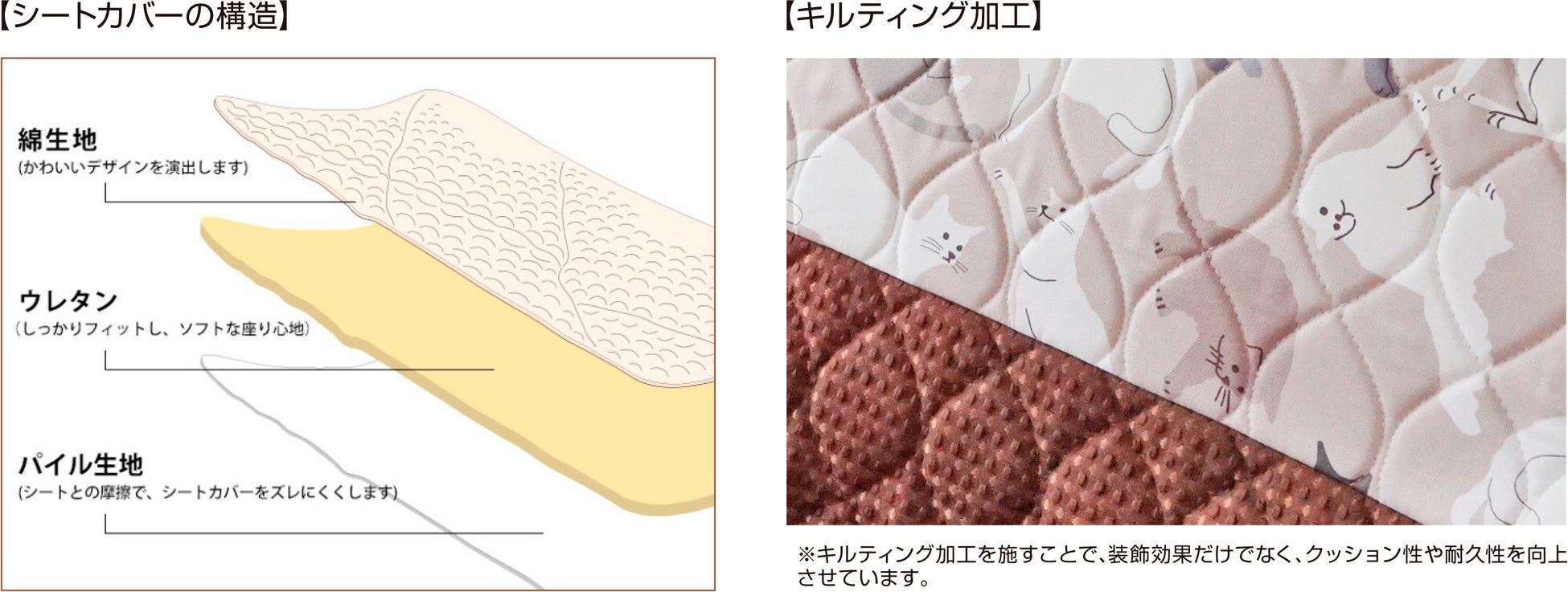 ココトリコのシートカバーは、クッション性のあるウレタンを中層に挟みこんだ3層構造を採用。フィット感とソフトな座り心地を演出します。1枚生地と比較して厚みがある分、使用時のヨレを軽減し、耐久性があり長くご利用いただけます。また、裏面にはパイル生地を採用し、シートとの摩擦によるずれを防ぎます。