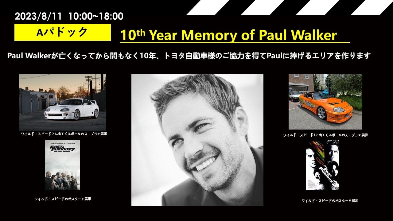 “ポール・ウォーカー・メモリアル・エリア”「For PAUL」を8月11日開催のFUELFEST JAPANでトヨタ自動車様のご協力を得て、3台のスープラを展示。さらに! 音楽ライブでは「きゃりーぱみゅぱみゅ」のスペシャル・ライブ、展示車両は2,000台オーバー、スーパーカーの走行枠、0-200mストリート・ドラック・レース、イベント会場(織戸パラダイス)、ドリフトエリア(フォーミュラードリフト)と1日では回り切れない、盛りだくさんのコンテンツで、40,000人のお客様を映画の世界へ引き込みます。車1台/33,000円なので、大きな車で7人で来場すると、1名/4,715円で来場でき、夏の思い出になる、最高な世界最大級のカー・フェスを体験できます。