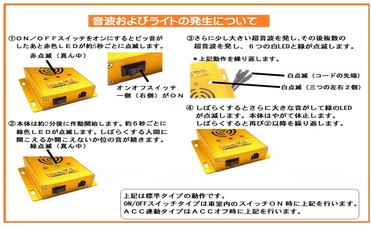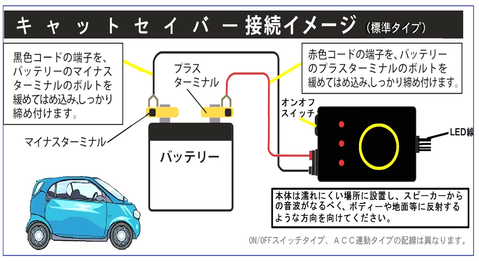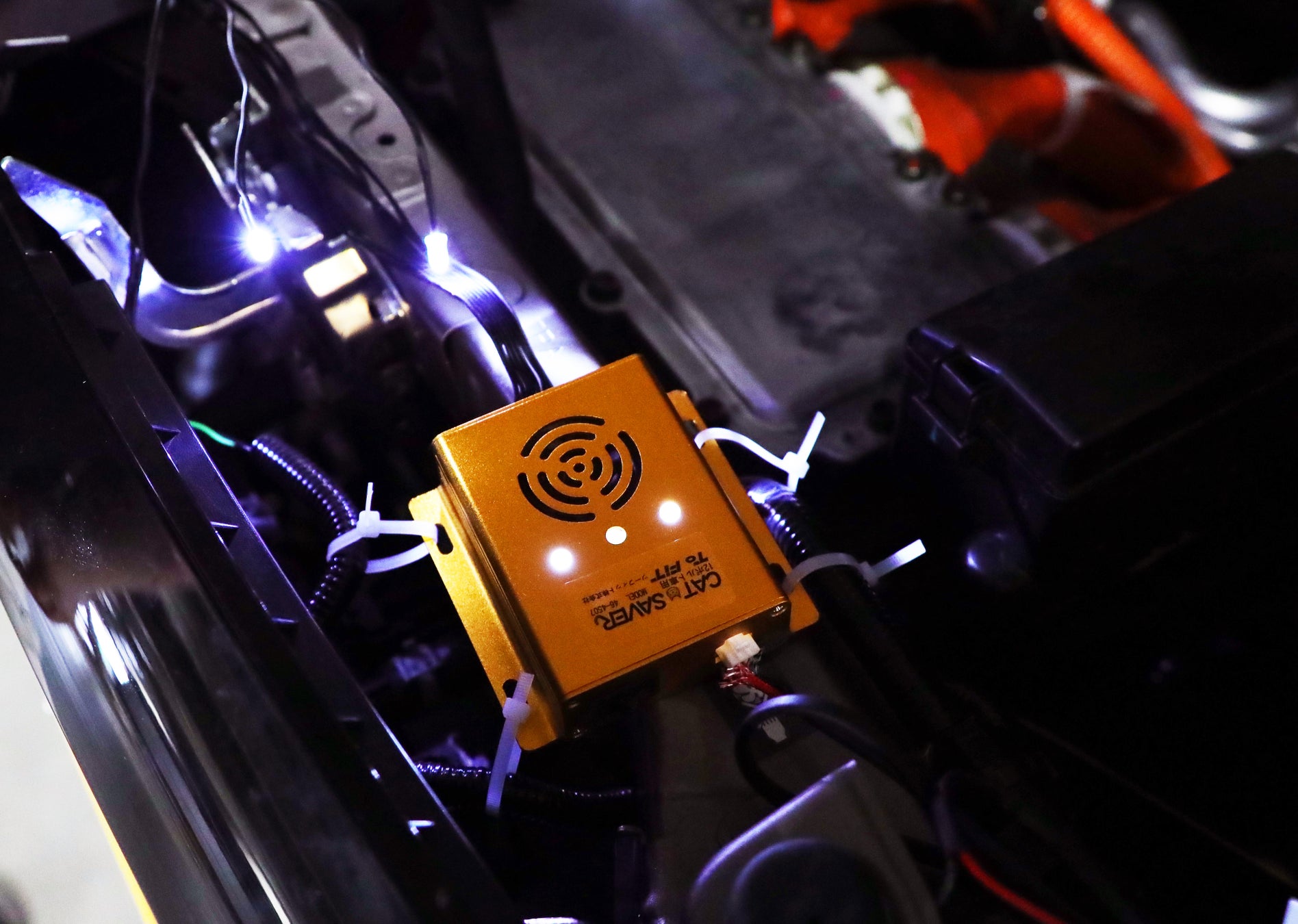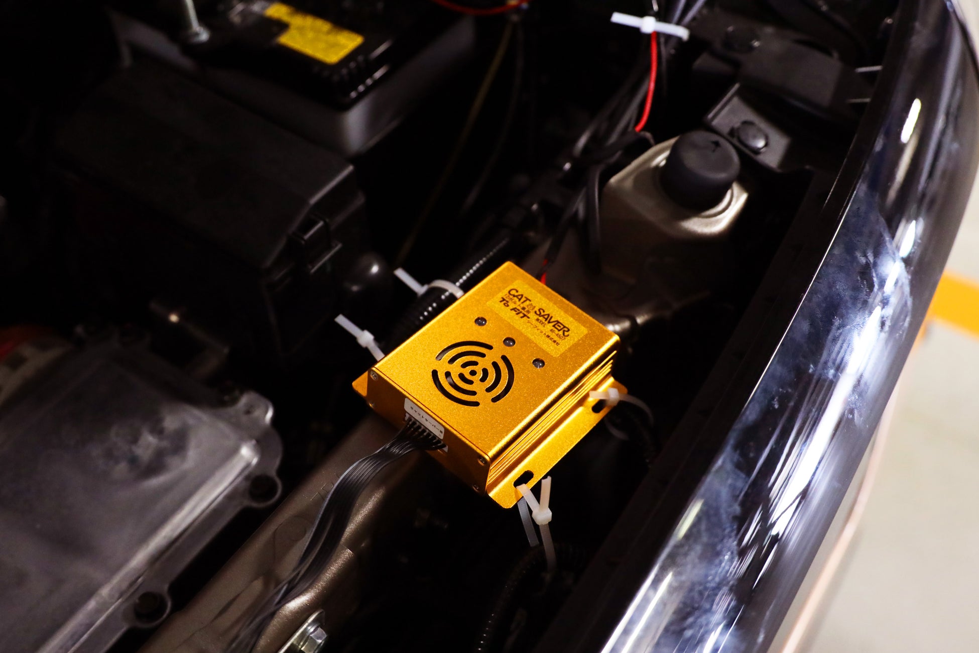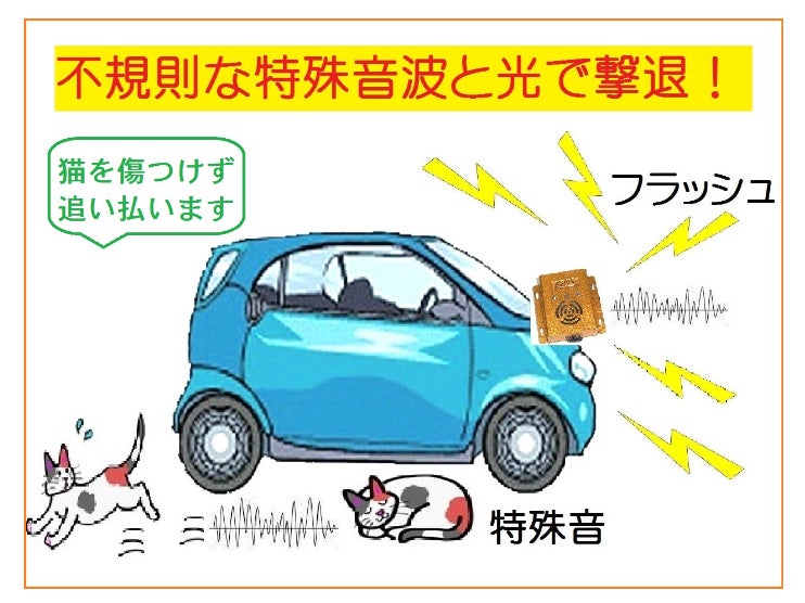 「キャットセイバーⅢ」は、エンジンルームなどに装着した本体から発生する音波や光によって、ネコがクルマの付近に滞在することを防ぐアイテムです。