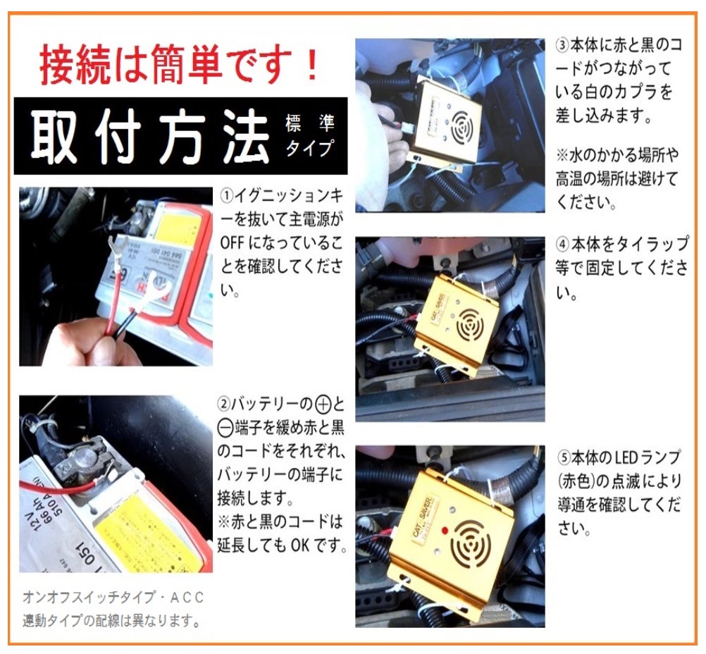 「キャットセイバーⅢ」の取り付けは、車載バッテリーのプラス/マイナス端子にコードを接続し、本体をフレームなどに固定させるだけのわずか2ステップです。