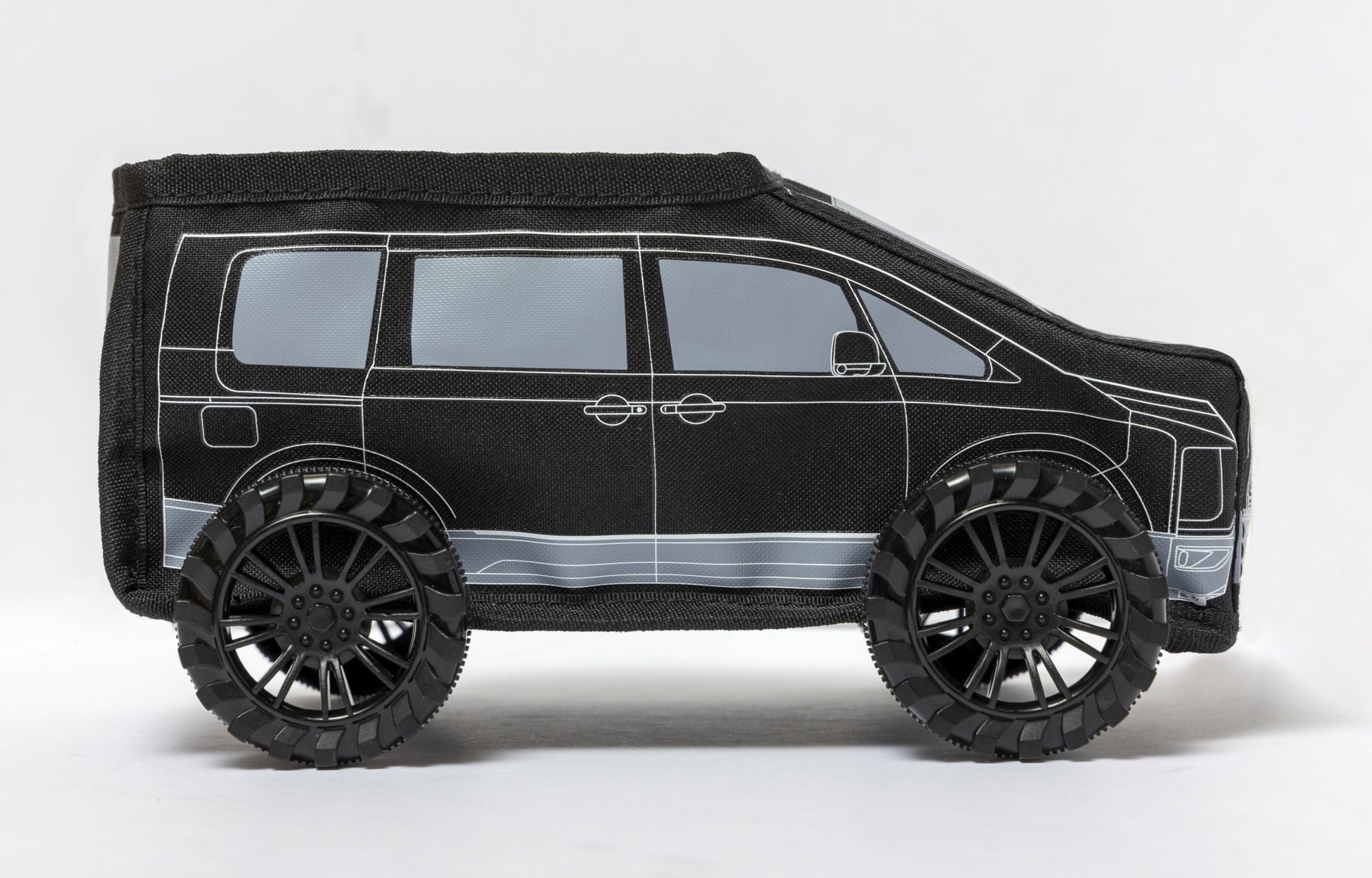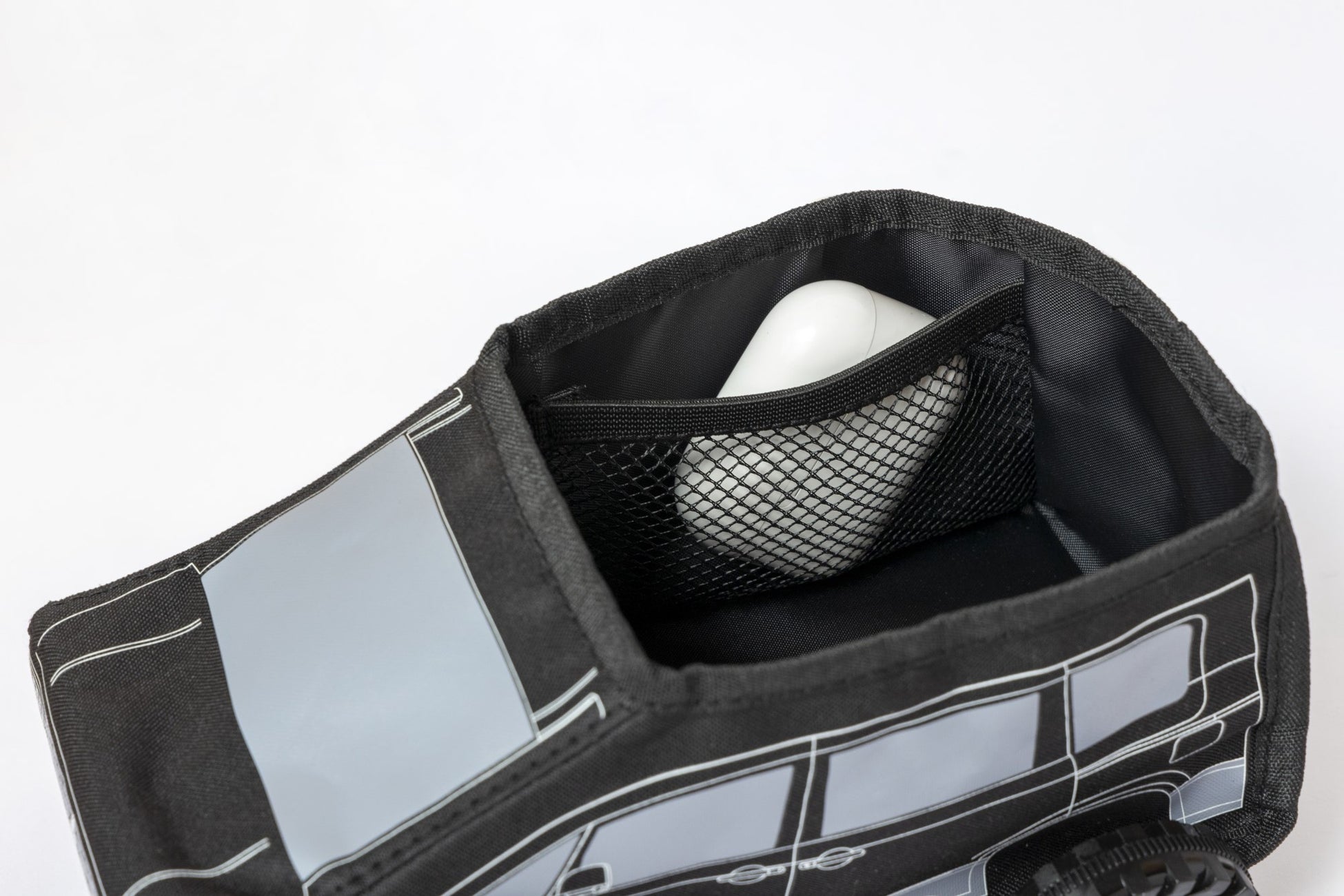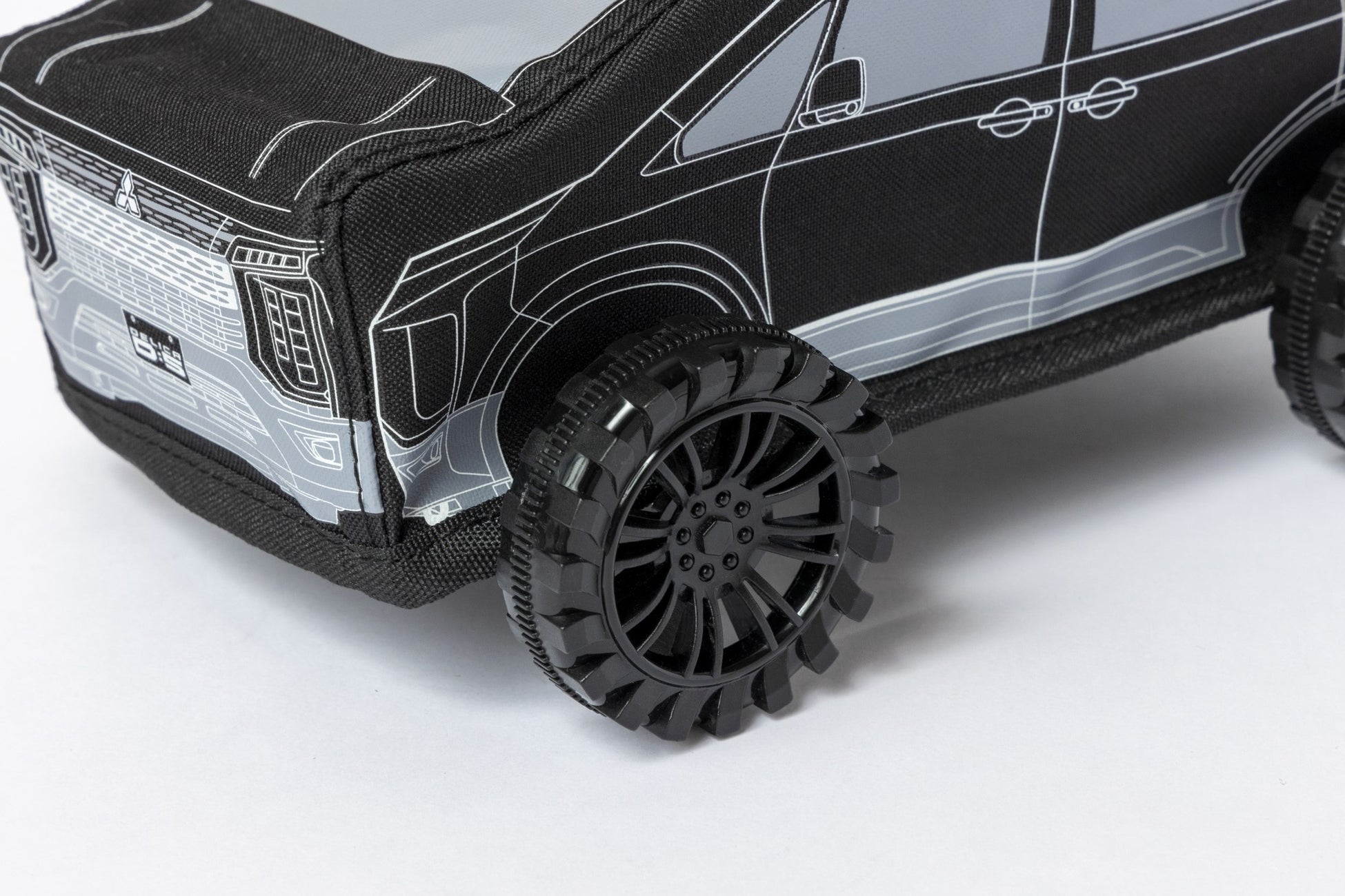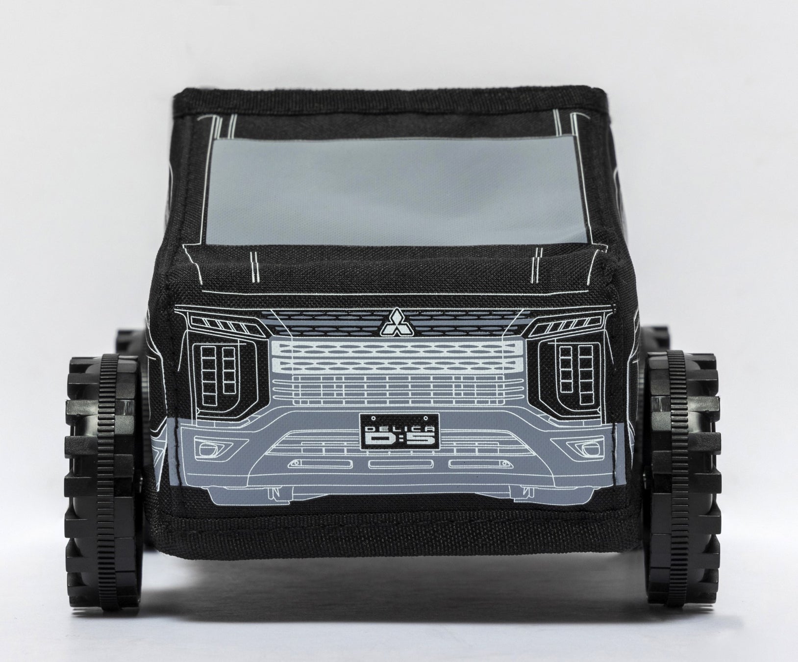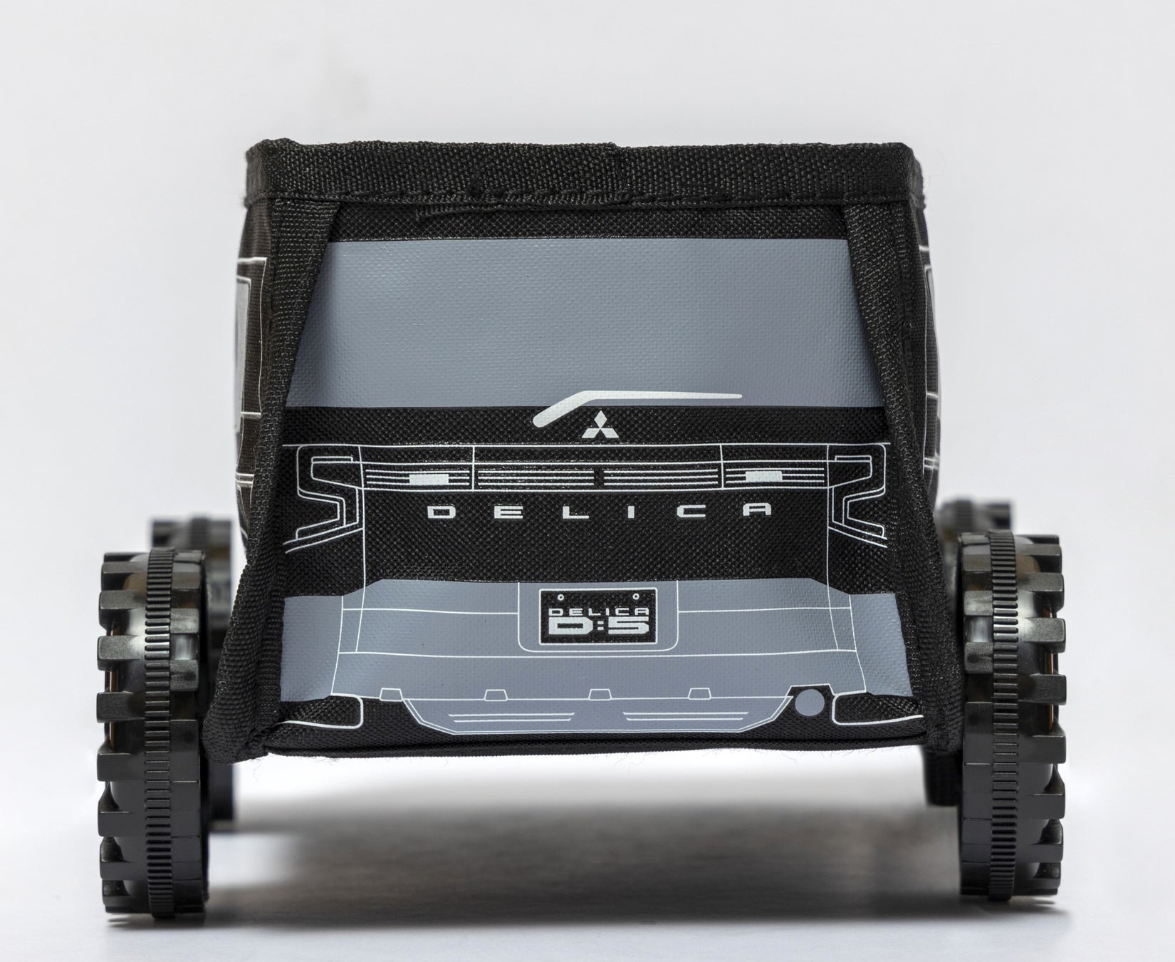 収納ボックスはブラック×グレーのモノトーンカラー。正面と背面は「デリカD:5」のフォルムをそのままミニチュアサイズに落とし込み、サイドには輪郭をプリントして、立体でもデリカらしさにこだわりました。内側はメッシュポケット付きで、リモコンや文具など、散らかりがちな雑貨をすっきり収納できます。タイヤが動かせるので、お子様のおもちゃとしてもおススメです。