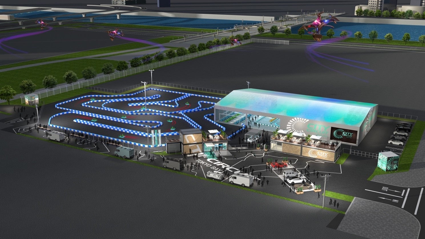 当施設は、レーシングカートの国内最高峰大会「全日本カート選手権」でEV部門の車両開発を手掛けるトムスが専用に開発したEVレーシングカートとシミュレーターを使用し、屋外および屋内コースで本格的な都市型レーシング体験とVRなどによるe-Motorsports体験を提供します。屋内コースでは、プロジェクションマッピングなど新技術を活用した今までにないドライビング体験を演出するほか、キッチンカーによる飲食、ラウンジやサウナなどの併設も計画しており、モータースポーツファンからファミリー層までが一日中楽しむことのできる空間を提供します。