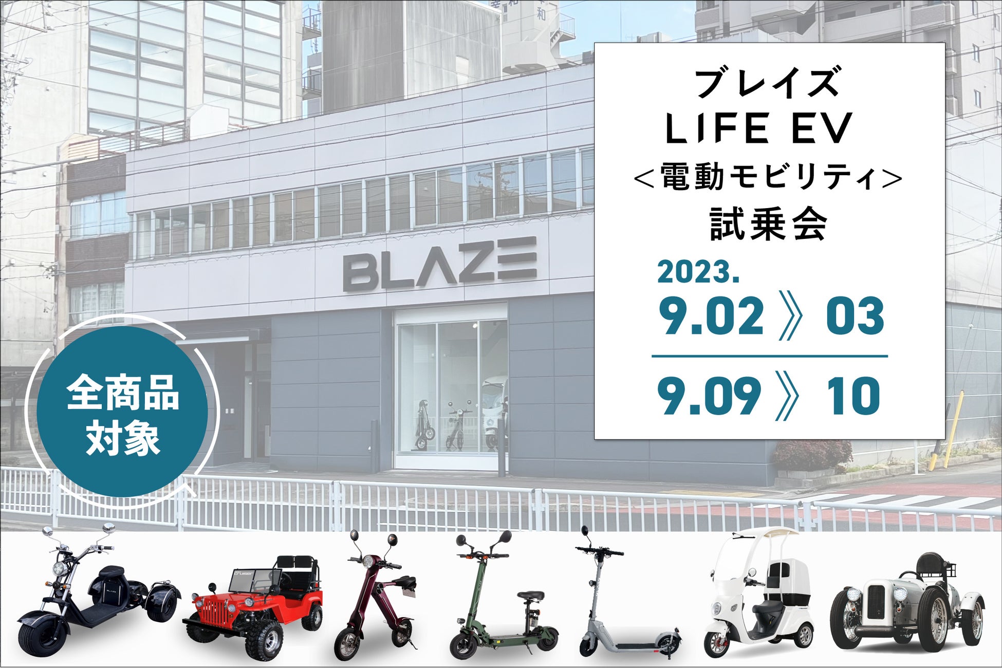 株式会社ブレイズ(愛知県名古屋市、代表取締役:市川秀幸、以下ブレイズ)は、2023年9⽉2⽇(土)、3⽇(日)および9日(土)、10日(日)に、ブレイズ本社(名古屋)にて、新商品の「キックボードEV」を含む全商品ラインアップを対象とする試乗会を開催いたします。