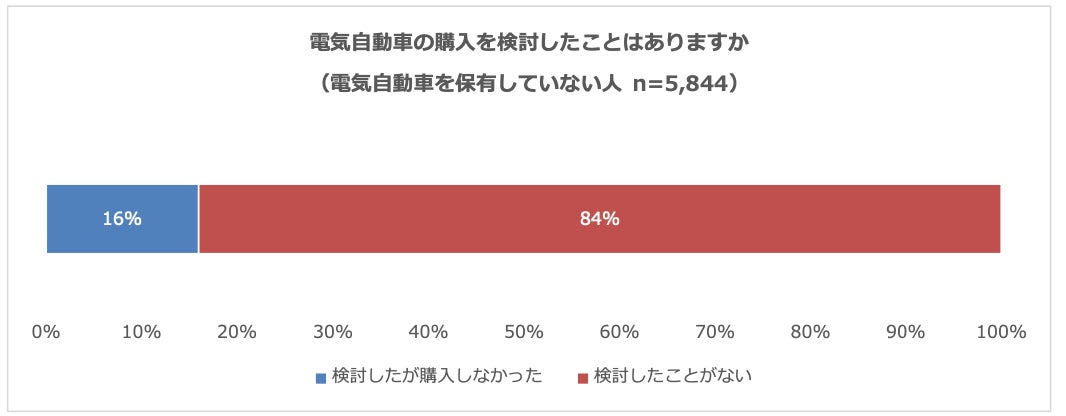 電気自動車を保有していない人の8割以上は、電気自動車の購入を検討したことがないことがわかりました。また、検討はしたものの購入しなかった人は16%でした。