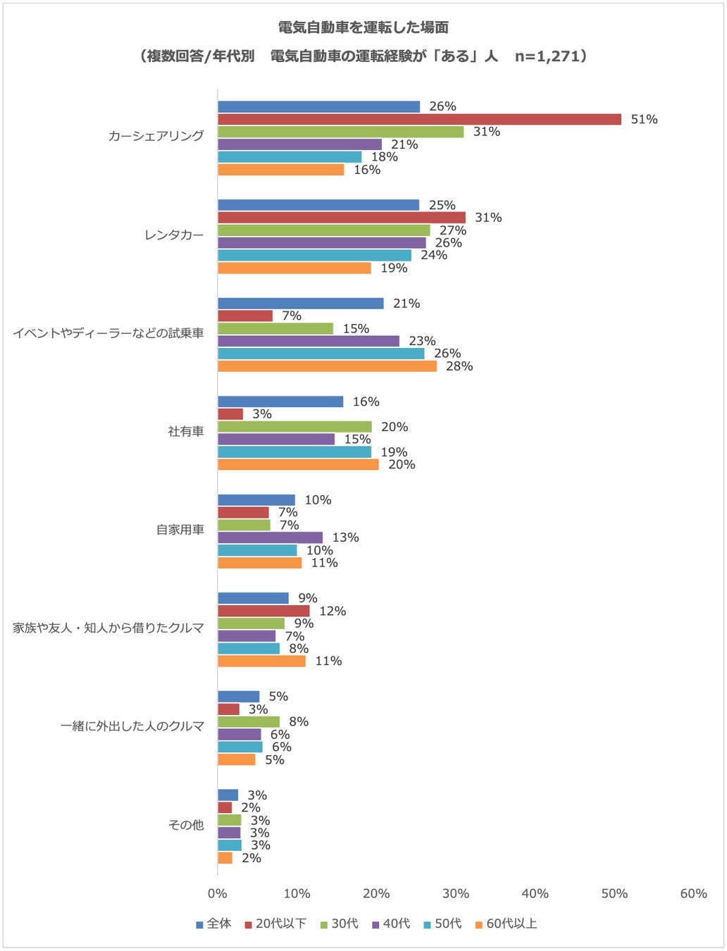 年代別で見ると、「カーシェアリング」は若い年代ほど比率が高く、20代以下は半数を超える51%となりました。一方、「イベントやディーラーなどの試乗車」は60代以上の28%が最多で、年代が上がるにつれて増加しています。年代によって電気自動車を運転した場面は様々でした。
