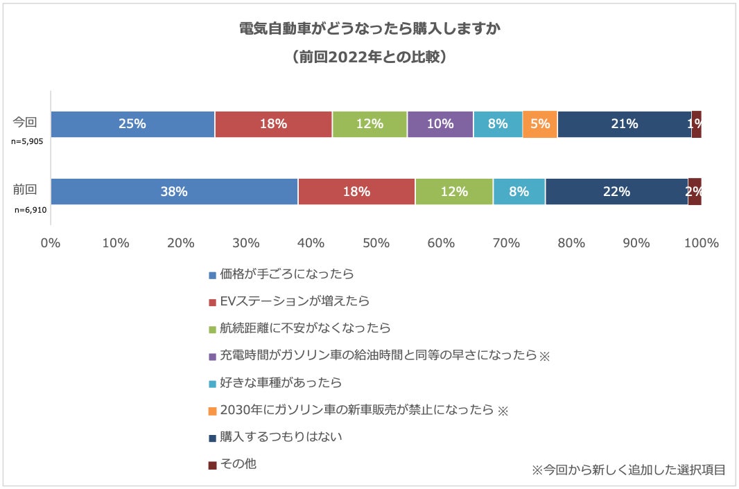 電気自動車を保有していない人に、電気自動車がどのようになったら購入するかを聞いたところ、「価格が手ごろになったら」25%が最多で、購入時には充電インフラより車体価格を重視することがわかりました。また、今回から新しく追加した項目の「充電時間がガソリン車の給油時間と同等の早さになったら」が10%、「2030年にガソリン車の新車販売が禁止になったら」が5%を占めており、価格だけでなく充電性能などの技術革新を望む人や、新車販売が電気自動車のみという状況になれば購入する人もいるようです。