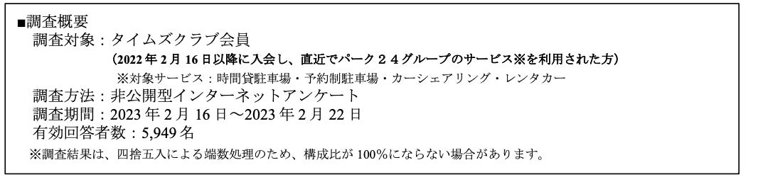 なお、本アンケートは、駐車場やカーシェア、レンタカー等のクルマに関わるサービスを利用した方々を対象としたものです。