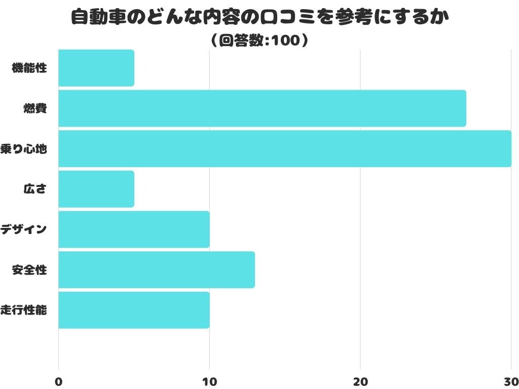 自動車のどんな内容の口コミを参考にするかをアンケートにて調査したところ、1位は「乗り心地」でした。