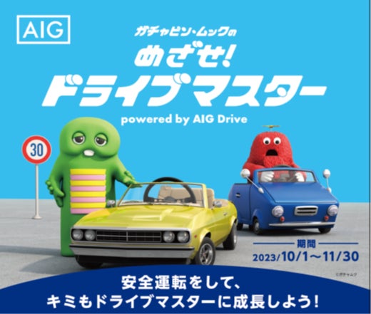 【東京、2023年9月20日】AIG損害保険株式会社(以下、AIG損保)は、安全運転診断アプリ「AIG Drive」を活用しドライバーの安全運転をサポートするため、2023年10月1日から11月30日に安全運転キャンペーン”ガチャピン・ムックの「めざせ!ドライブマスター」“を実施します。