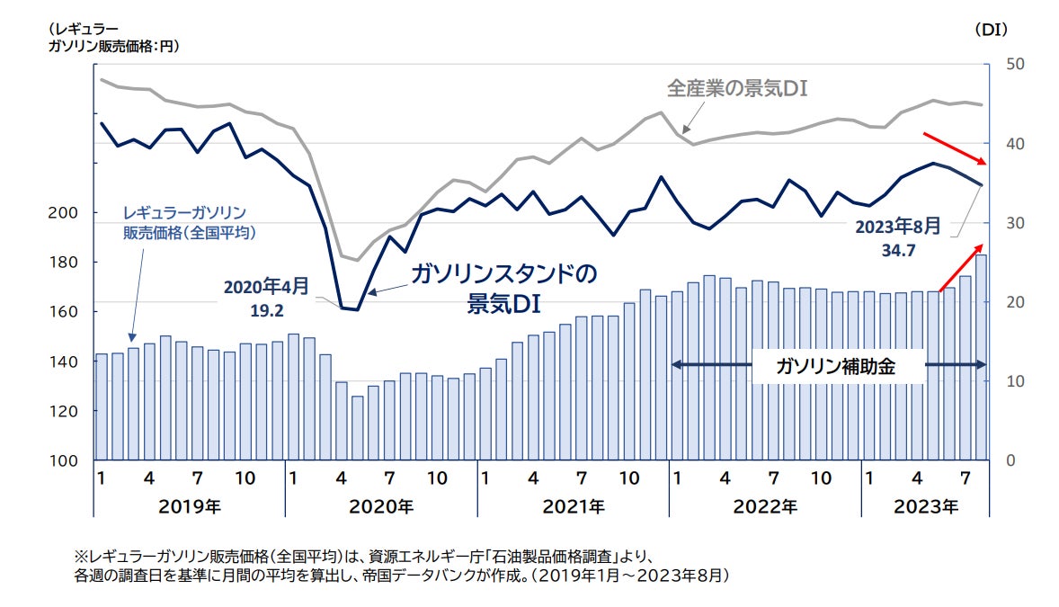 そこで帝国データバンクでは、ガソリンスタンド業界を取り巻く環境や景気DI の動きを調査した。