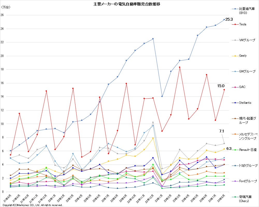 首位BYD、2位Tesla、3位VWグループという結果になった。
