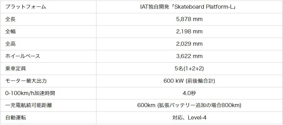 IATは世界の自動車メーカーの要望に応えるEVプラットフォームを大型から超小型まで複数有しております。T-MADは大型EVプラットフォームに合計600kWの高出力モーターをフロントとリヤに1基ずつ搭載しています。1充電あたりの航続距離は600kmですが、拡張バッテリーを追加すれば800kmの走行が可能です。