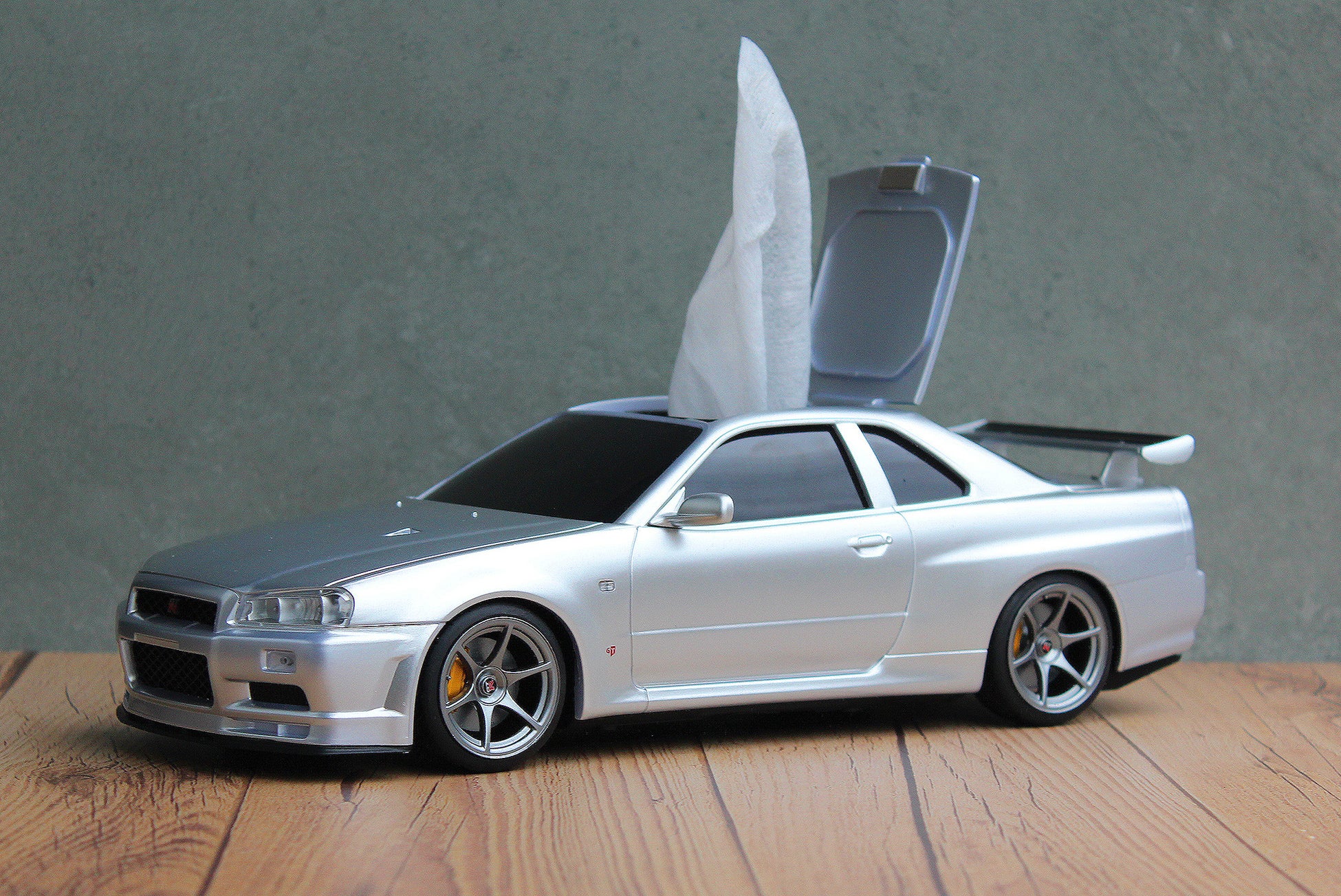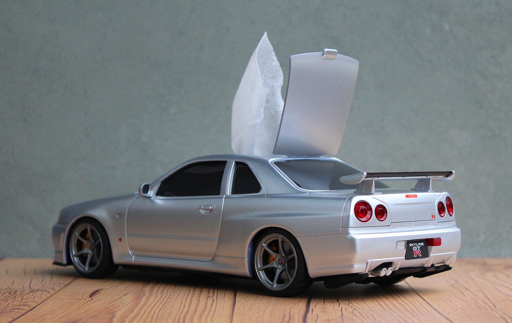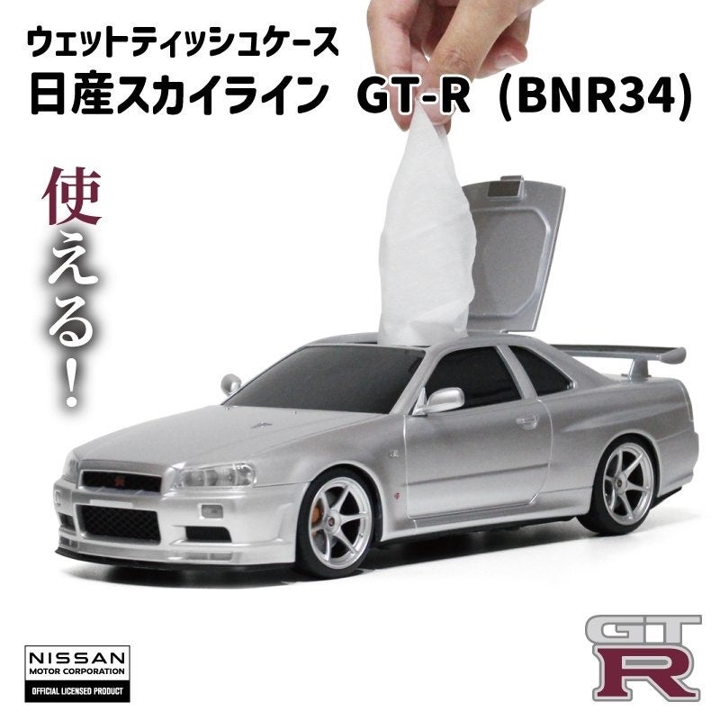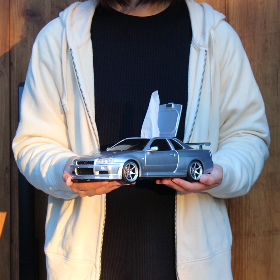 まるでミニカーのような見た目の日産スカイラインGT-R(BNR34)型のウェットティッシュケースを発表。