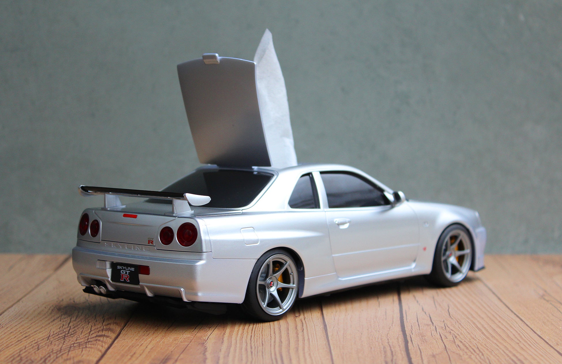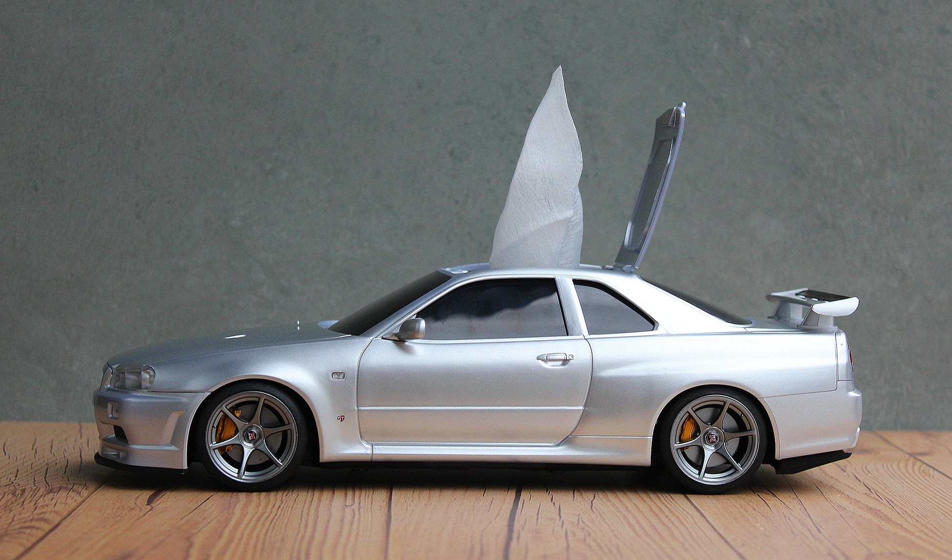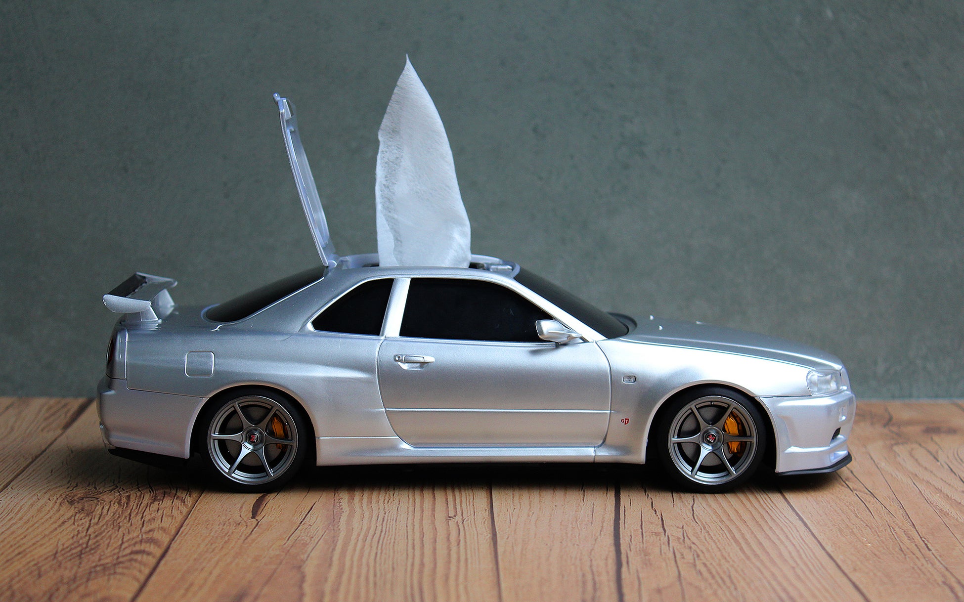 まるでミニカーのような見た目の日産スカイラインGT-R(BNR34)型のウェットティッシュケースを発表。