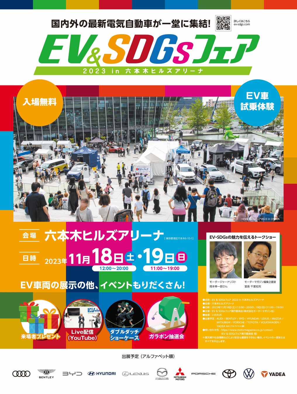 当イベントは人気車雑誌「モーターマガジン」がプロデュースし(事務局:株式会社新創社)、2023年6月の大阪に次ぐ4回目の開催となります。六本木ヒルズアリーナ(東京)では初開催で、車両展示、試乗体験の他、EVとSDGsの魅力を伝えるトークショーを始め、ダブルダッチのショーケースなど多彩なコンテンツを用意しています。入場は無料。来場者アンケートに答えていただいた方にはイベントオリジナルの記念品を贈呈します!