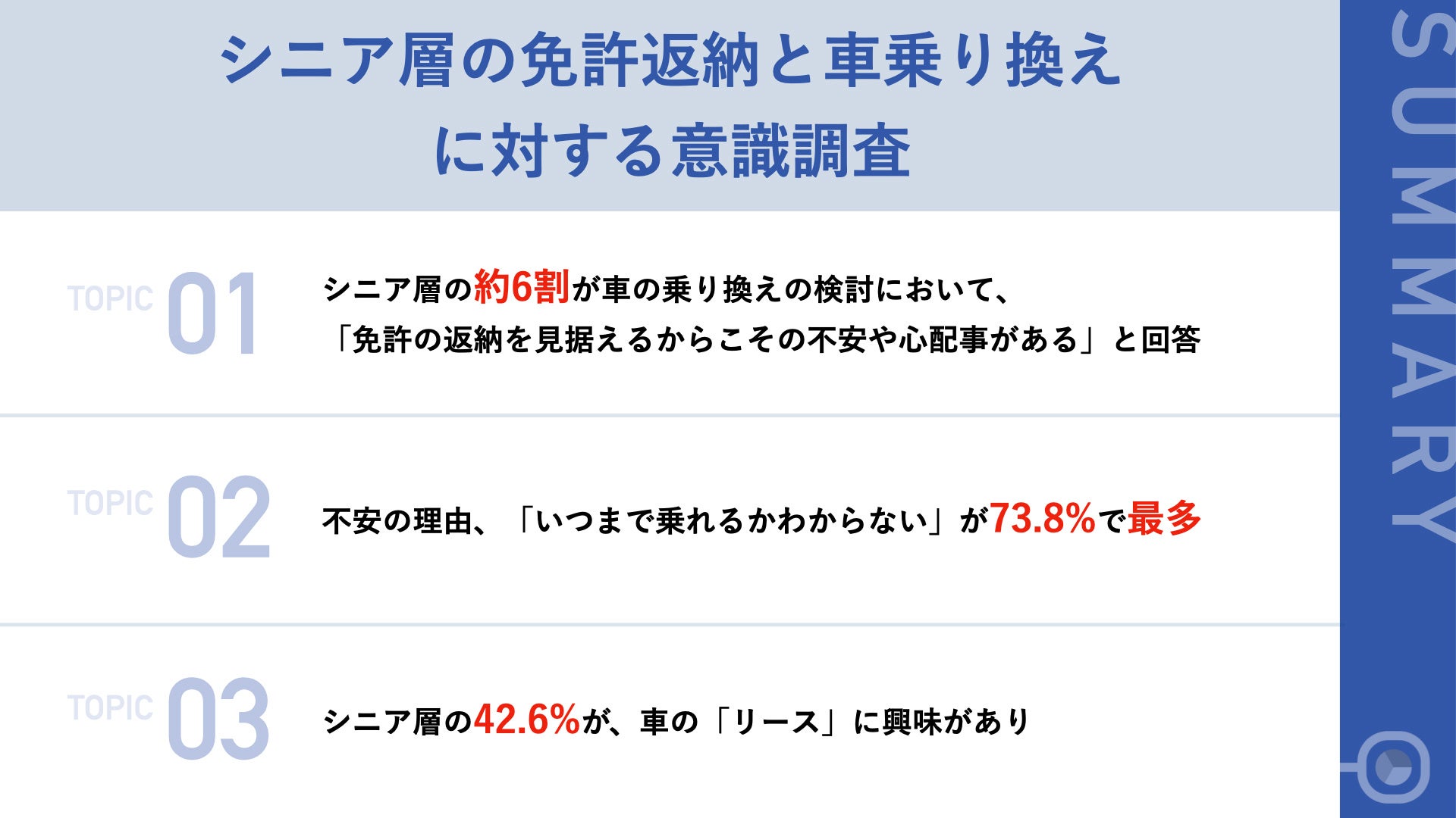 - 車の乗り換えの検討において、約6割が「免許返納を見据えるからこその不安や心配事がある」と回答