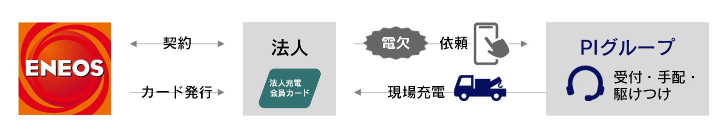 「ENEOS Charge Plus法人充電会員カード」は、ENEOSが提供する「ENEOS Charge Plus」を用いて社用車のEVを充電し、法人単位で一括請求・管理できるカードです。この度の追加サービスは11月13日より同カードに無料で自動付帯され、「電欠駆けつけサービス」の受付から車両復旧までの一貫したオペレーションをPIグループが担い、利用者へ同サービスを提供します。