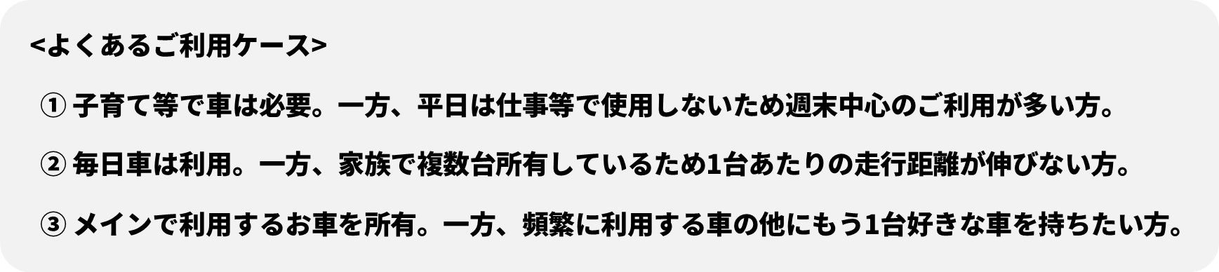 週末中心にお車をご利用のお客様はもちろん、毎日車をご利用になる一方で家族で複数台所有していることから1台当たりの走行距離が伸びないケースや、セカンドカーとしてご利用されるお客様に多くお問い合わせをいただいております。
