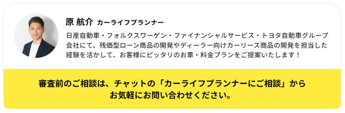また、「自分に合うサービスかわからない」 「自分の走行距離に合ったプランが分からない」といったお悩みをお持ちの方を対象に、専門のカーライフプランナーとチャット・お電話・オンライン会議等でご相談いただける機会をご用意しております。仮審査お申し込み前はもちろんのこと、審査通過後でも専門スタッフとご相談の上、お申し込みの車種・料金プランの変更が可能ですので、お気軽にお申し込みください。
