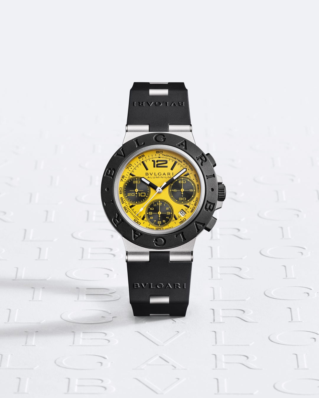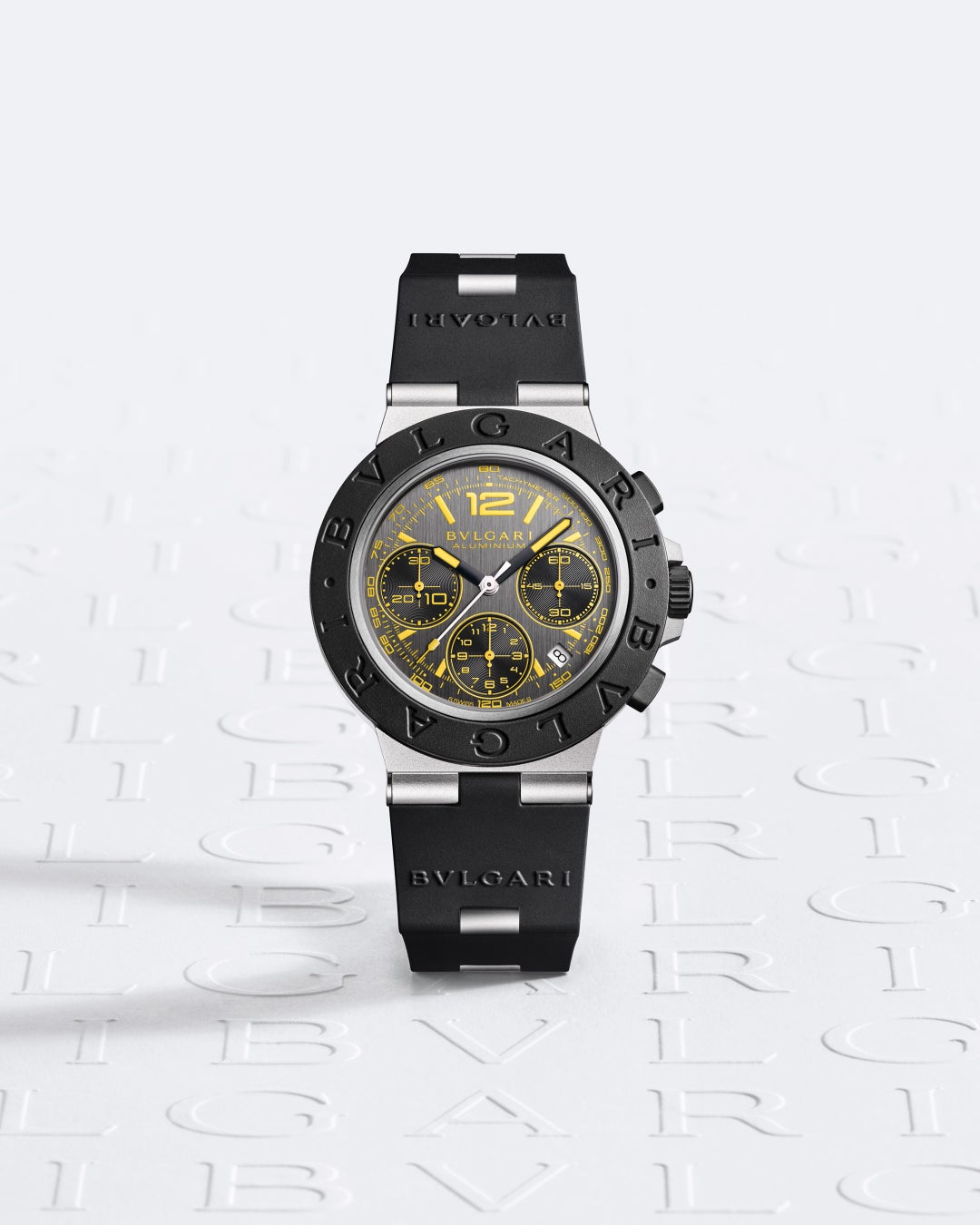 このタイムピースは、「ブルガリ アルミニウム」の魅力的で大胆なキャラクターを通して「グランツーリスモ」の世界観を表現しています。本来のスマートさとクールさはそのままに、1990年代の伝説的なイタリアのグランツーリスモカーのダッシュボードのダイヤルにインスピレーションを得た、鮮やかなイエローが目を捉えます。堅牢な軽さを誇るアルミニウムケースと、”BVLGARI”の文字が刻印されたベゼルに使用されたソフトなラバーがセットされています。スポーティで革新的な素材の融合は、アルミニウムリンクを特徴とするラバー製ブレスレットにも見ることができます。リューズとケースバックはブラックDLC加工を施した耐久性がありかつ軽量なハイテク素材のチタニウム製で、10周年を記念した「ビジョン グランツーリスモ」のロゴが刻印されています。