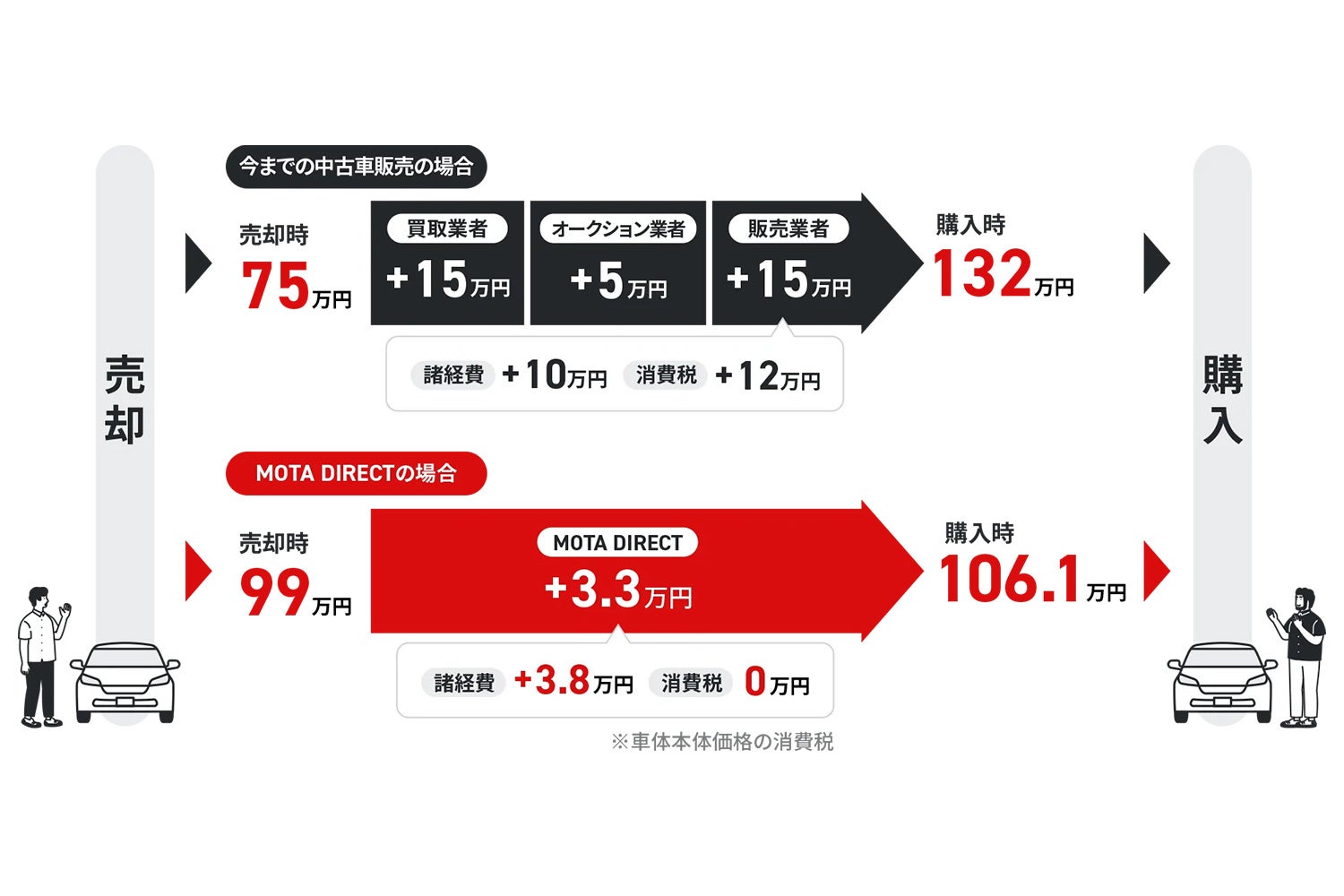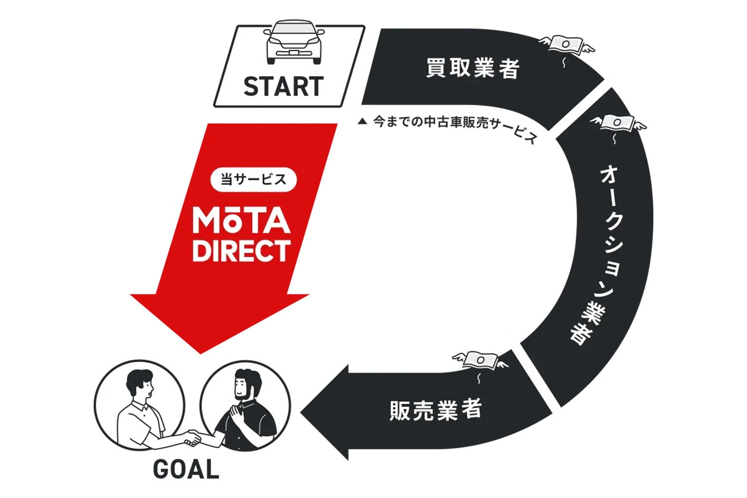 MOTA DIRECTは車を「いつもより高く売れて、安く買える」中古車売買スキームを刷新したサービスです。