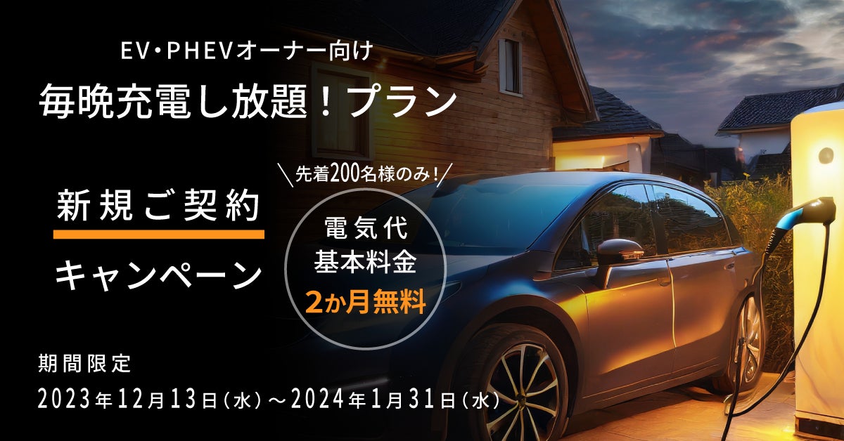 本キャンペーンは対象期間2023年12月13日(水)から2024年1月31日(水)までに「毎晩充電し放題!プラン」もしくは「毎晩充電し放題!CO2フリープラン」に、新規でお申込みされた先着200名様限定で、電気代基本料金が2か月間無料になります。