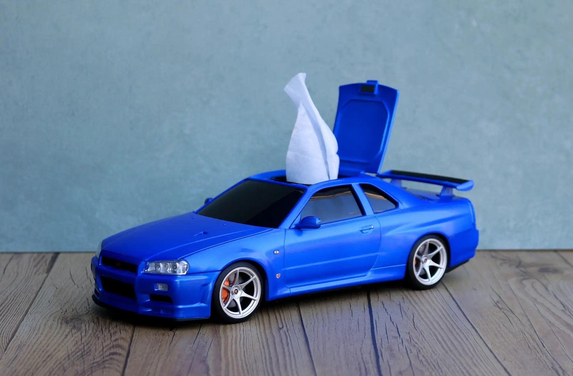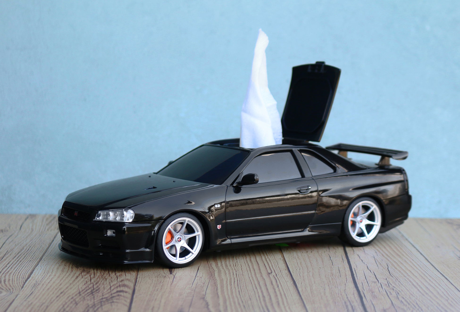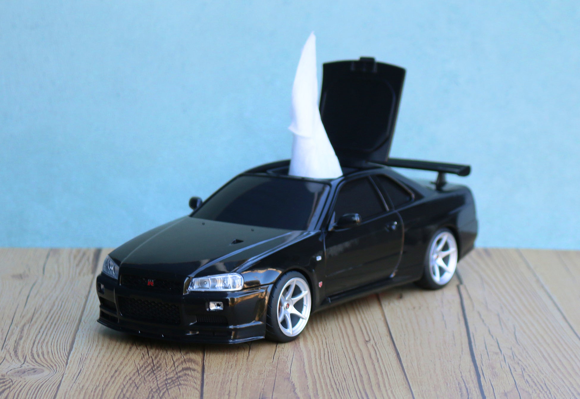 スカイラインGT-R(BNR34)型のウェットティッシュケース(ブラック)が予約開始。