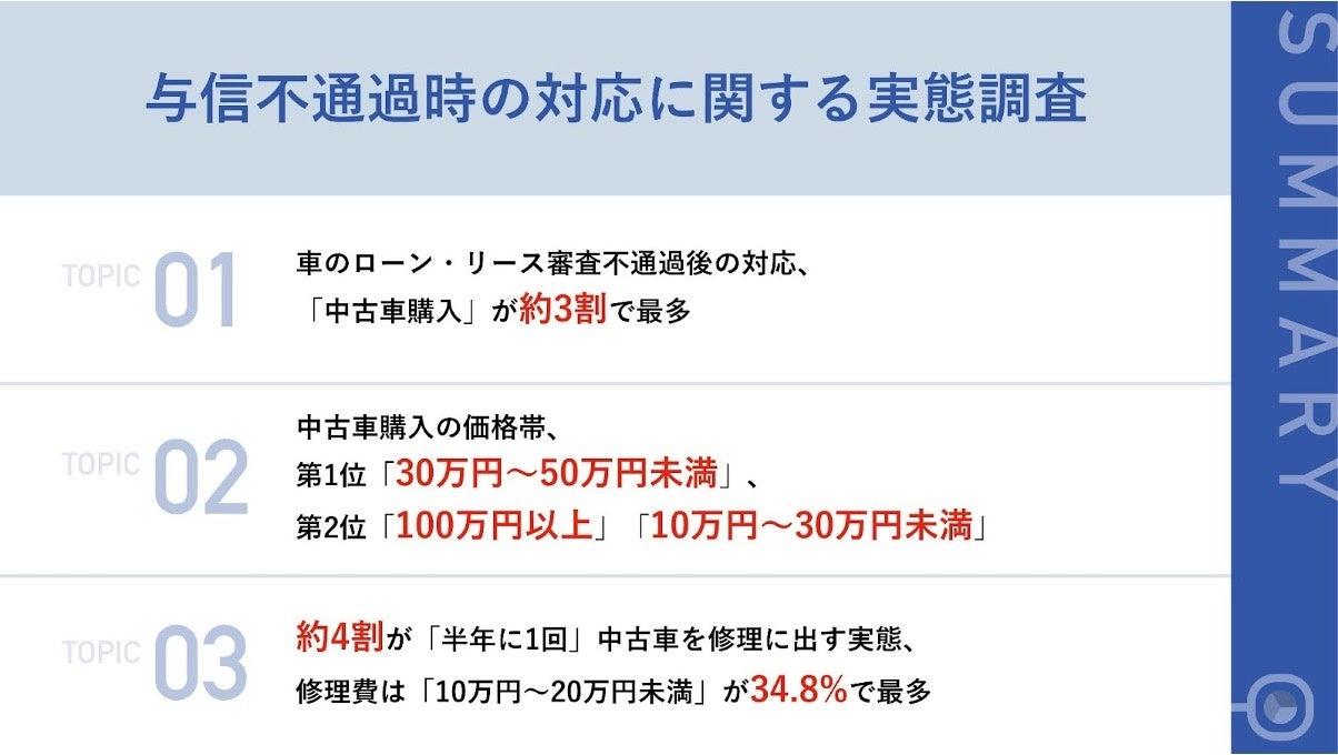 今回の調査では、車のローン・リースの与信が不通過となった後の対応に関する実態が浮き彫りとなりました。特に中古車の購入を選択した人は、購入後も車の不具合による修理の経験者が多く、頻繁に故障することになれば車両購入費用を超える修理費を支払わなければならない事態も想像できます。自営業や個人事業主の方はローンが通りにくい実態もあることから、そのような方でも安心して新車に乗れるサービスのニーズがありそうです。