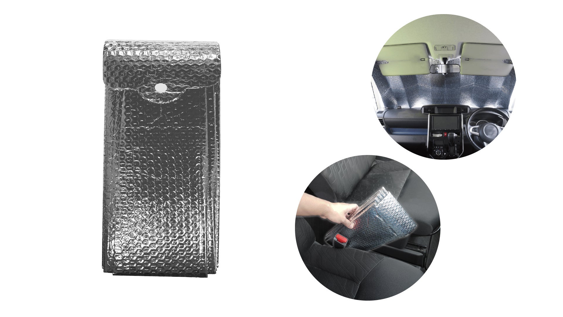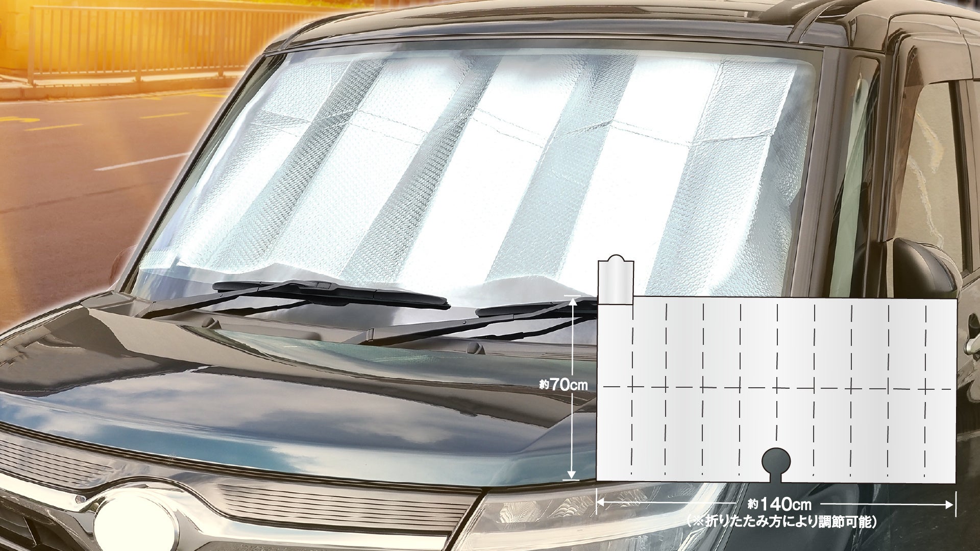 特徴:5秒で収納!折りたたみの線がしっかり入っているので、隙間に「サッ」と収まるサイズまでコンパクトに収納可能です。フロントガラスのサイズ(約W140cm×H70cm)までカバー。車内温度の上昇防止や仮眠時の目隠しにおススメです。