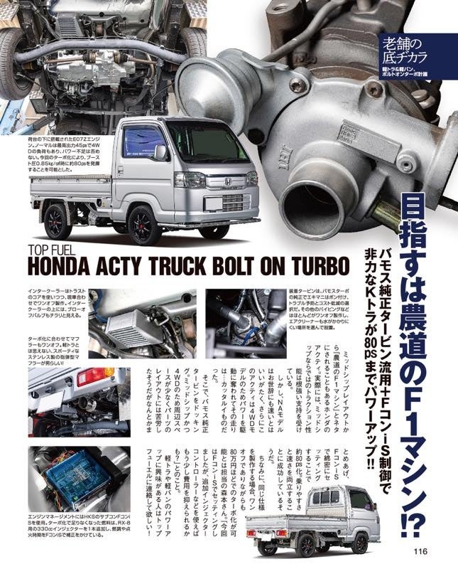 基本はスポーツ系の軽自動車を題材としたカスタム&チューン専門誌ですが、飛び抜けたチューンを施した車両に対しては積極取材の姿勢。今回は軽トラックのボルトオンターボ車両も取材・掲載。
