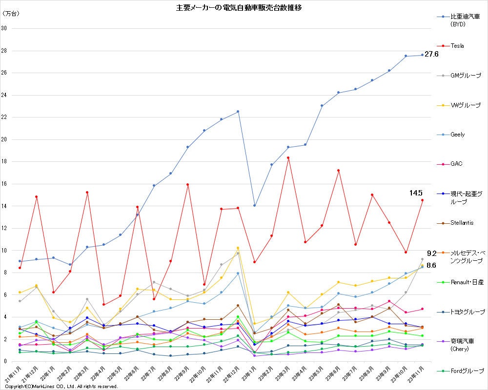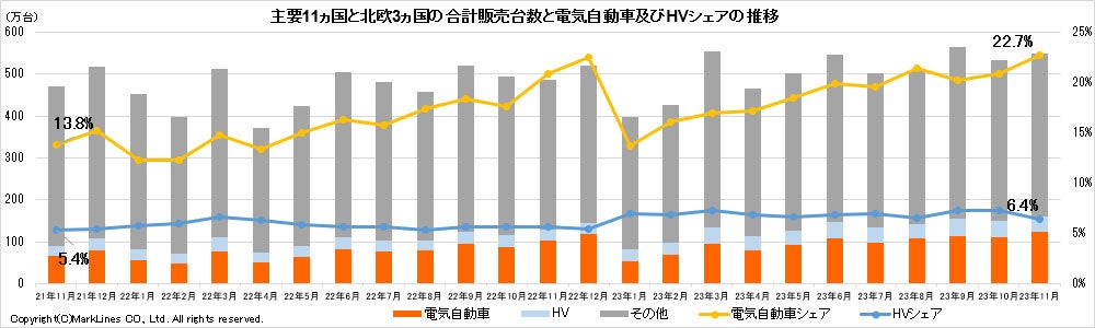 マークラインズ株式会社(本社:東京都千代田区、代表取締役社長:酒井 誠、http://www.marklines.com/) は、電気自動車の世界販売の約90%をカバーする主要14カ国を対象にグローバル市場における電気自動車の台数情報及び販売動向を分析した2023年11月の電気自動車(BEV/PHV/FCV)販売月報(商用車を除く、推計値を含む)を掲載しました。