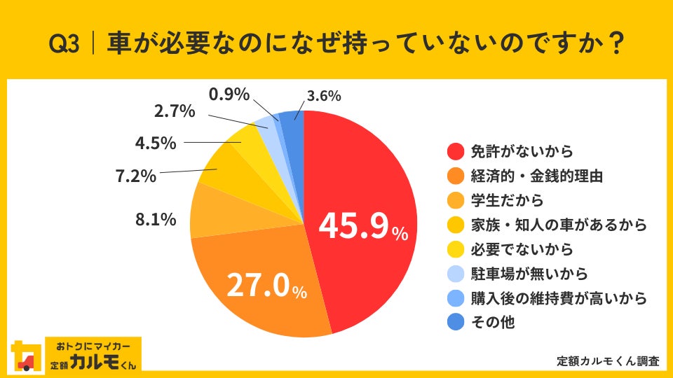 続いて、Q2で「持っていない」と回答した方に理由を聞いたところ、最も多かったのは「免許がないから」で45.9%、次いで多かったのは「経済的・金銭的理由」で27.0%でした。昨年と比較すると、主な理由は同じであるものの、「免許がないから」と答えた方の割合が増える結果となりました。