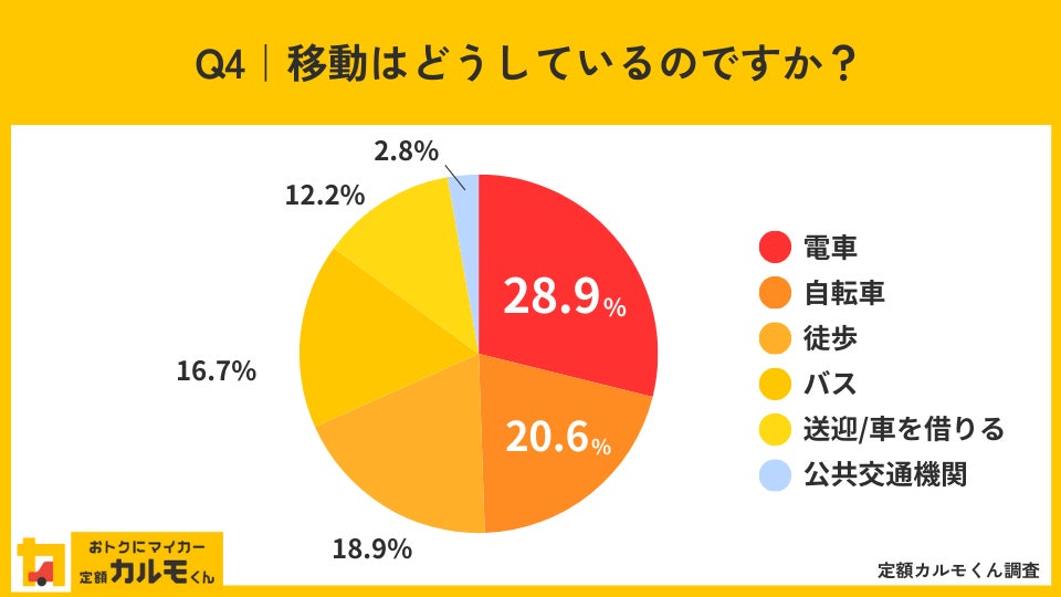 さらにQ2で「持っていない」と回答した方に、移動はどうしているのか聞いたところ、最も多かったのは「電車」で28.9%でした。次いで多かったのは「自転車」で20.6%でした。昨年と比べ、「電車」を利用している方の割合が2.5%増えたほか、「徒歩」を選んでいる方が5%増えていることがわかりました。