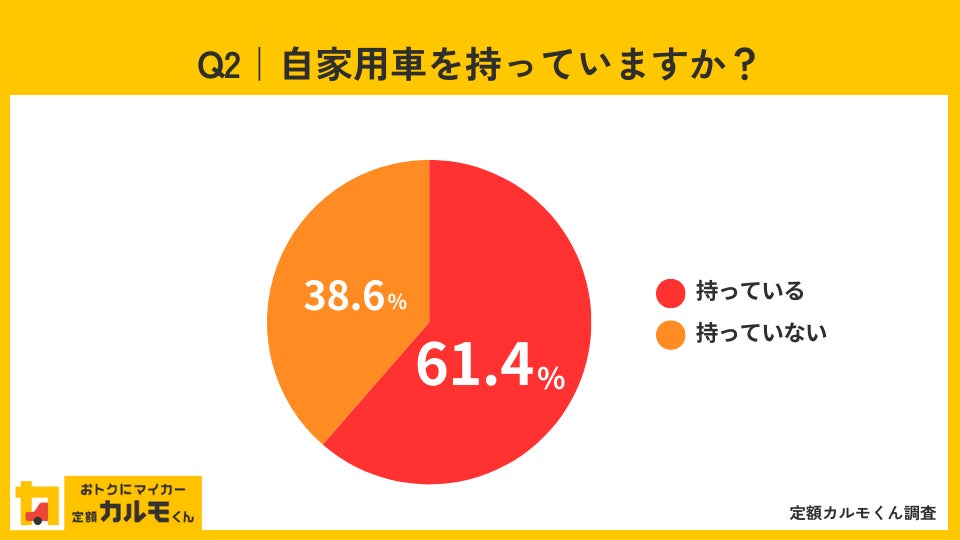 続いて、Q1で「必要」と回答した方に、自家用車を持っているかどうか聞いたところ、「持っている」が61.4%、「持っていない」が38.6%という結果となりました。車を必要だと感じているものの、約4割の方は自家用車を持っていないことがわかります。