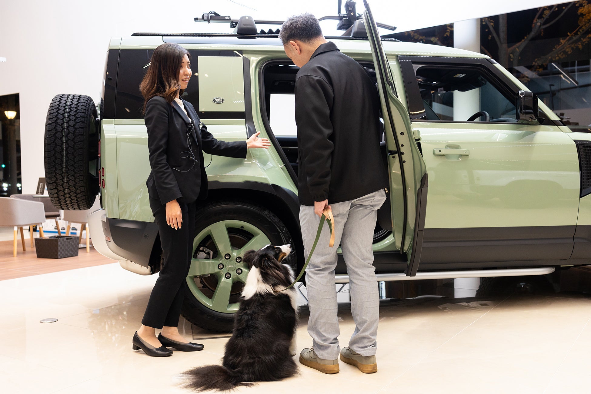 私たちが取り扱うさまざまなブランドからSUV車が登場し、犬を連れてクルマでお出かけをされる愛犬家の方も多くいらっしゃいますが、これまで犬を連れて入店することができず、実際に愛犬と試乗することができませんでした。八光エルアールでは、家族の一員である愛犬とのカーライフをより豊かなものにしたいという想いから、AsoboLabo(アソボラボ)と提携してスタッフマニュアルを作成。1月5日より、大阪・なんばの大型ショールームから、犬連れでの入店が可能となりました。