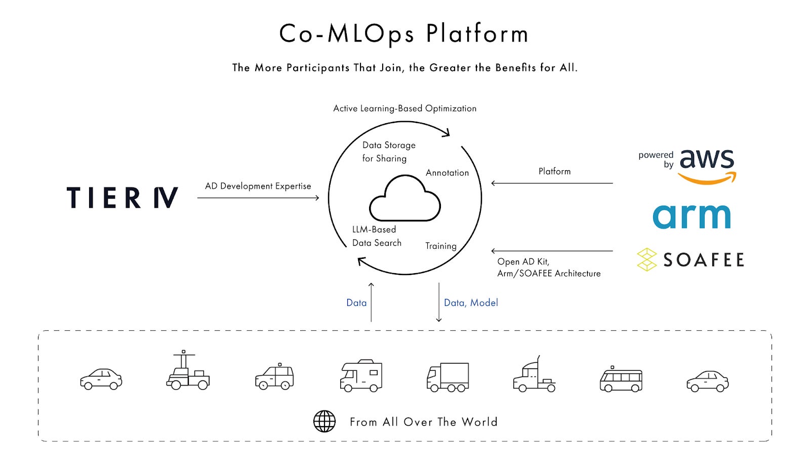 オープンソースの自動運転ソフトウェアを先導する株式会社ティアフォー(以下「ティアフォー」)は、自動運転のためのAI(Artificial Intelligence)の開発をスケールさせる新たな取り組みとして、Co-MLOps(Cooperative Machine Learning Operations)プロジェクトを開始しました。本プロジェクトにて開発するCo-MLOps Platformを導入することにより、世界中の様々な地域で収集されるカメラ画像やLiDAR(Light Detection and Ranging)点群などのセンサデータが共有可能となり、さらにCo-MLOps Platform上で提供されるMLOps機能やエッジAIのリファレンスモデルを活用することで、各社が独自の自動運転AI開発を強化できることが期待されます。