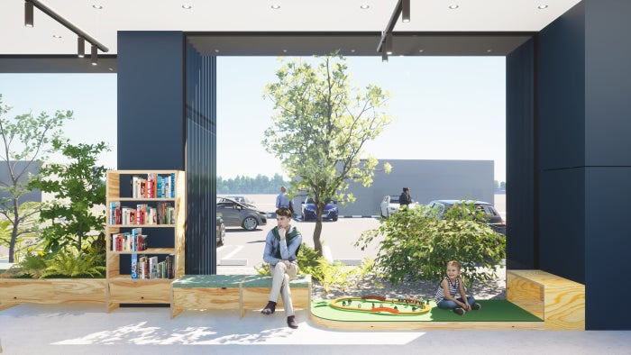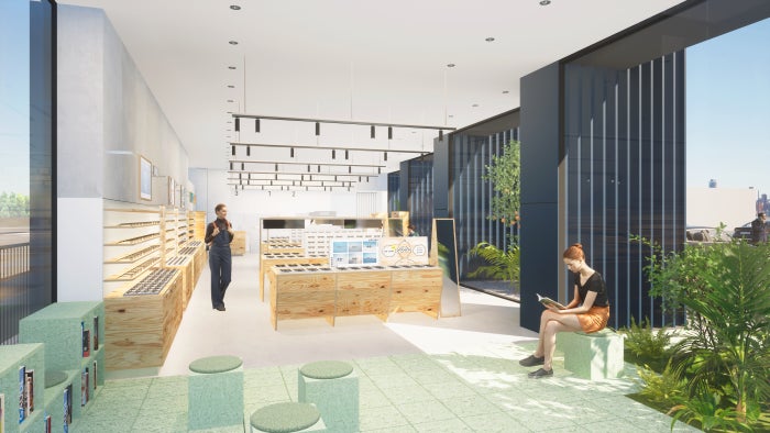 外観は、車の街らしくメタリックなガレージが、リズミカルに連なっている特徴的なデザイン。ファサード部分には、ガレージの開口部に見立てた大きなガラス窓を設け、ゆったりとお買い物を楽しんでいただける、のびやかな空間を演出します。また、店舗の外から店内のエントランスまで床を同じタイルで仕上げ、繋がりを持たせています。さらに、店内の植栽帯は、ガラス越しに店外の植栽帯と一体感を持たせるように配置することで、開放的で居心地の良い空間となっています。