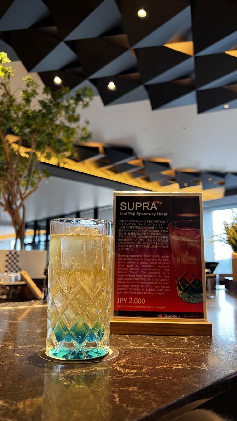 ウェルカムドリンクには、日本とアメリカにルーツを持つSupraにインスパイアされ、ジャパニーズウイスキー「山崎」の樽で熟成された梅酒と、アメリカ生まれのフルーツリキュール「Soco」を組み合わせて独特なフルーティーさを演出した限定カクテル「SUPRA feat.Fuji Spedway Hotel」も提供しました。