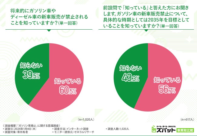 ・将来的にガソリン車やディーゼル車の新車販売が禁止されることを知っている割合は、アンケート回答者全体の60.5%(617人)。