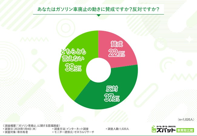 ・ガソリン車やディーゼル車の新車販売禁止に関しては、「賛成」が22.9%、「反対」が37.8%、「どちらとも言えない」が39.3%と、意見が割れた。