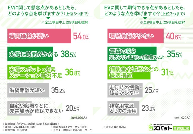 ・EVに関する懸念点は、「車両価格が高い」が全体の54.0%を占め、最多。そのほか、38.5%の人が「充電に時間がかかる」、36.8%の人が「充電スポット・水素ステーション等の不足」と答えた。