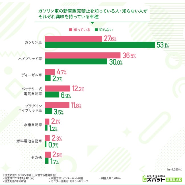 ・一方で、ガソリン車の新車販売が禁止されることを知らない人(403人)の半数以上は、興味を持つ車種として「ガソリン車」を挙げており、その割合は53.1%だった。「ハイブリッド車」「バッテリー式電気自動車」「プラグインハイブリッド車」などの割合は、ガソリン車の新車販売禁止を知っている人の割合よりも少なかった。