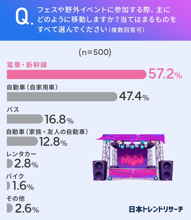 フェスや野外イベントに参加する際、主にどのように移動するか当てはまるものをすべて選んでもらいました。