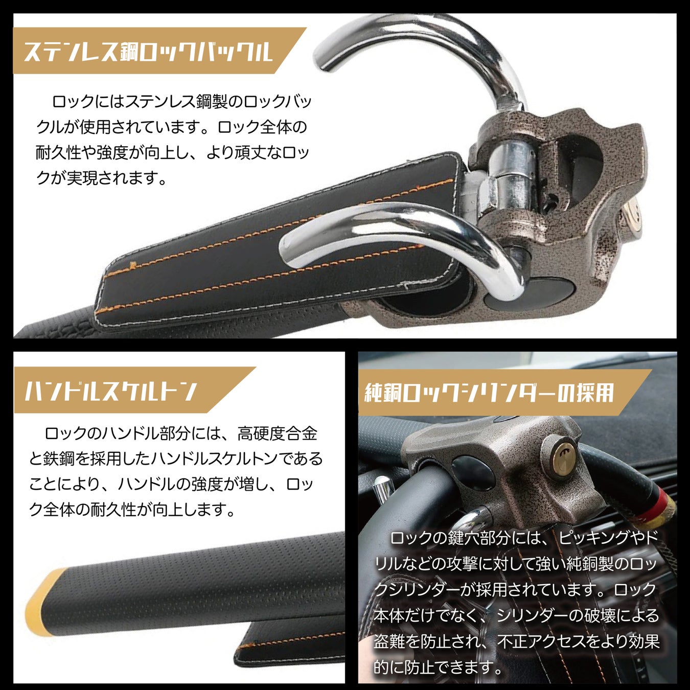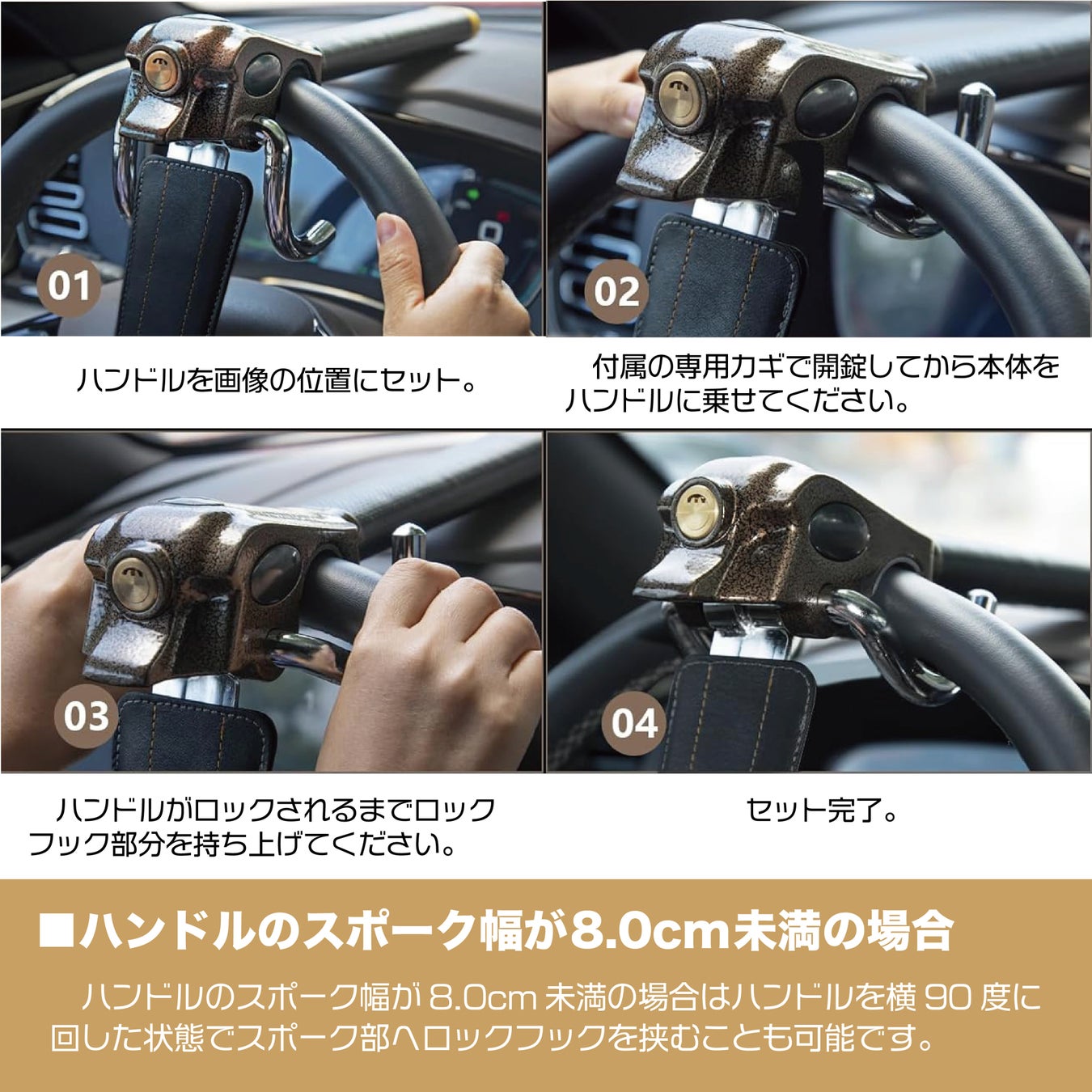 スポーク幅7cmまでのハンドルに取り付け可能。ロックが不足している場合は、六角レンチを使用して調整することができ、車と接触する部分(ロックフォーム層、ポリッシュロッククラスプ、レザーハンドル)はすべて緩衝設計を採用しており、愛車に傷つかない。