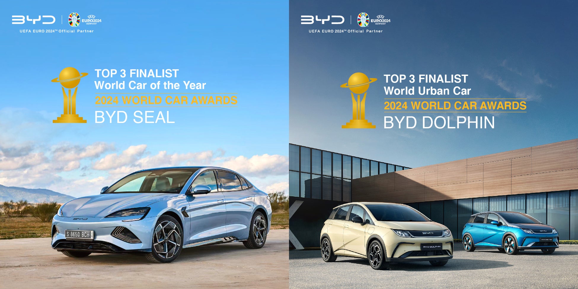 2024年2月26日、ジュネーブモーターショーにおいて、ワールド・カー・アワード2024のファイナリストが発表され、多数の競合を抑え、BYD SEALとBYD DOLPHINがそれぞれ「ワールド・カー・オブ・ザ・イヤー」と「ワールドアーバンカー」カテゴリーでトップ3入りを果たしました。これによりBYDは、「ワールド・カー・オブ・ザ・イヤー」カテゴリーにノミネートされた初の中国自動車メーカーとしての快挙を達成しました。