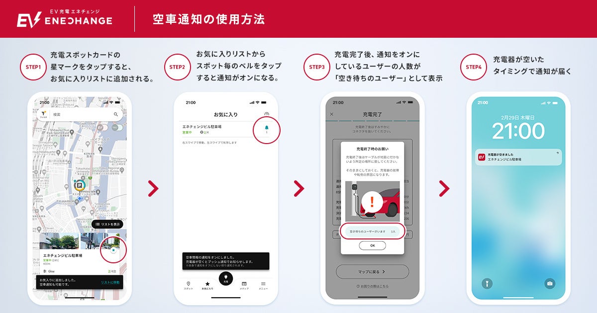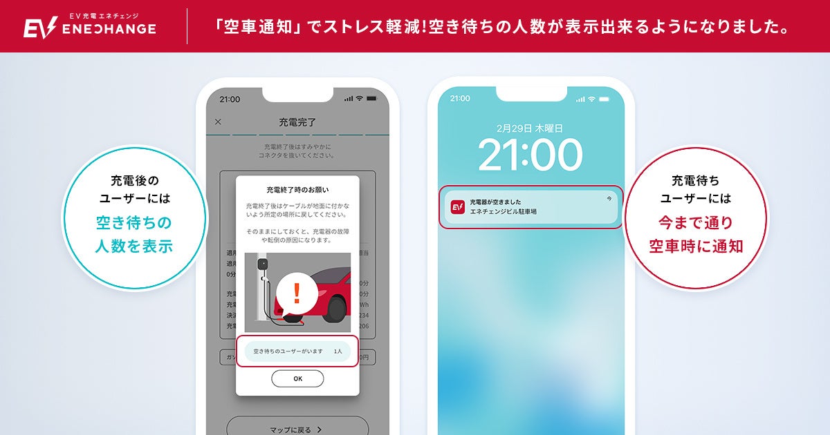 ENECHANGE(エネチェンジ)株式会社(本社:東京都中央区、代表取締役CEO:城口洋平、以下:エネチェンジ)は、EV充電エネチェンジアプリの既存機能をアップデートした「空車通知」で、これから充電器を利用したい人には「登録したスポットでの充電利用終了(利用可能)のお知らせ」を、充電利用終了した人には「充電器を利用したい人の数」を表示できるようになりました。